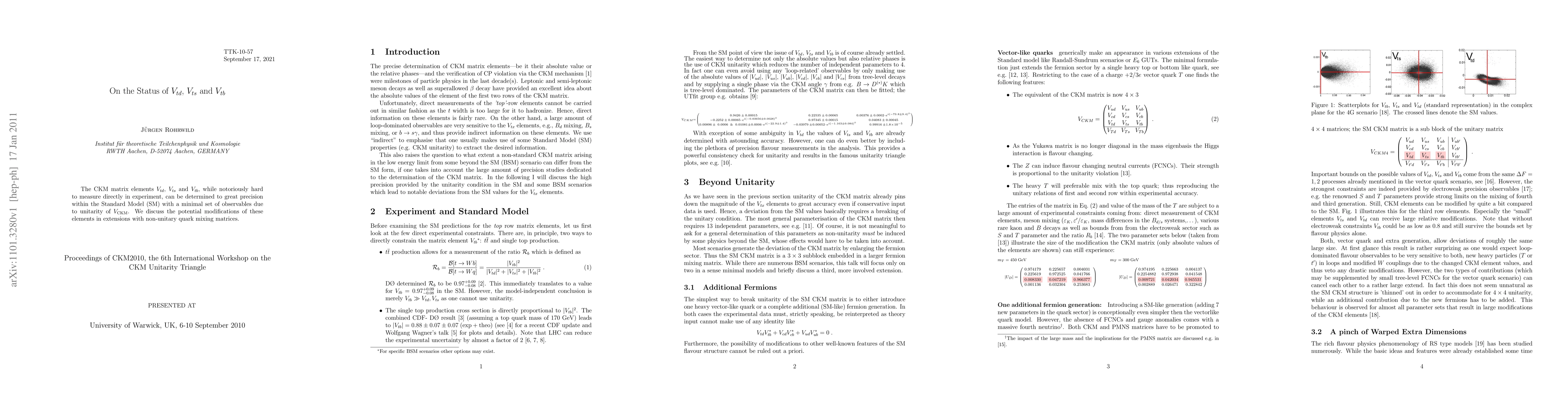 The research discusses the determination of CKM matrix elements $V_{td}$, $V_{ts}$, and $V_{tb}$ using unitarity of the CKM matrix, reducing the number of independent parameters to 4. It explores potential modifications in extensions with non-unitary quark mixing matrices, focusing on scenarios like additional fermions and warped extra dimensions.