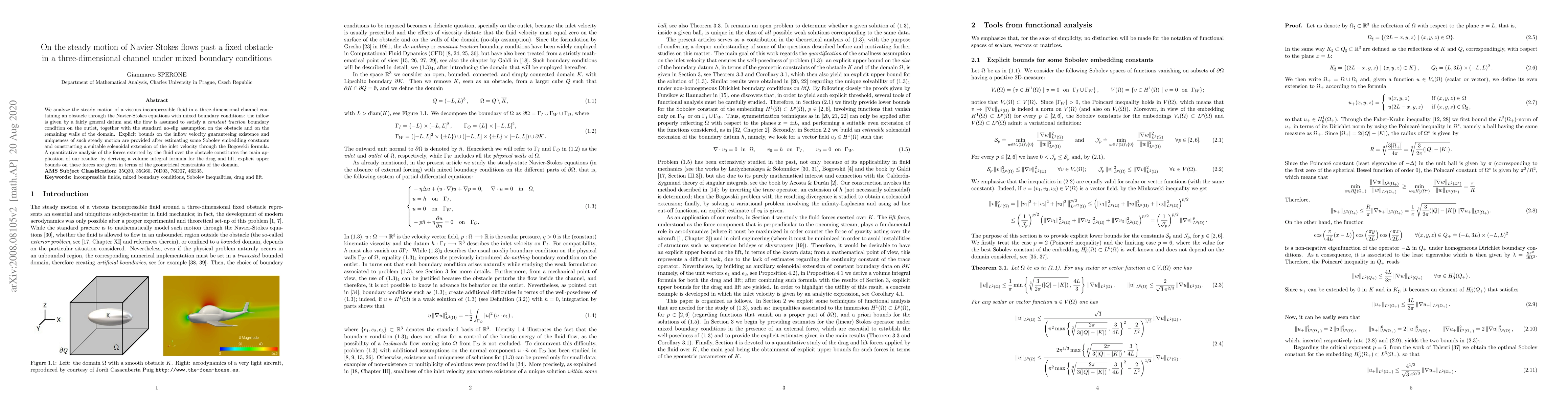 Researchers analyzed steady motion of viscous fluid in a 3D channel with an obstacle under mixed boundary conditions, providing bounds on inflow velocity for existence and uniqueness of the flow, as well as explicit upper bounds on forces exerted by the fluid over the obstacle.