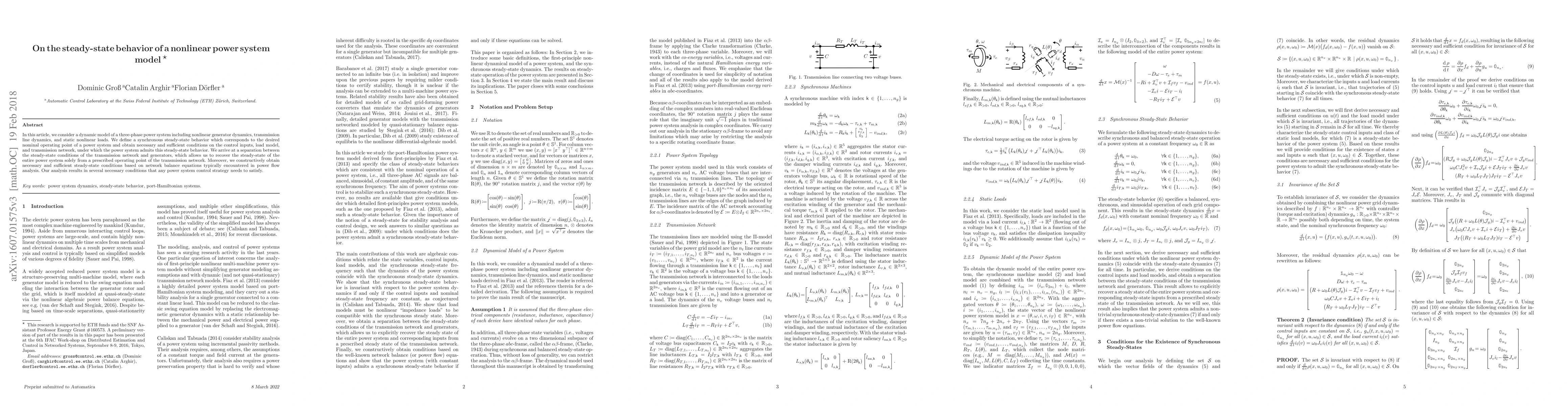 In this article, we consider a dynamic model of a three-phase power system including nonlinear generator dynamics, transmission line dynamics, and static nonlinear loads. We define a synchronous steady-state behavior which corresponds to the desired nominal operating point of a power system and obtain necessary and sufficient conditions on the control inputs, load model, and transmission network, under which the power system admits this steady-state behavior. We arrive at a separation between the steady-state conditions of the transmission network and generators, which allows us to recover the steady-state of the entire power system solely from a prescribed operating point of the transmission network. Moreover, we constructively obtain necessary and sufficient steady-state conditions based on network balance equations typically encountered in power flow analysis. Our analysis results in several necessary conditions that any power system control strategy needs to satisfy.