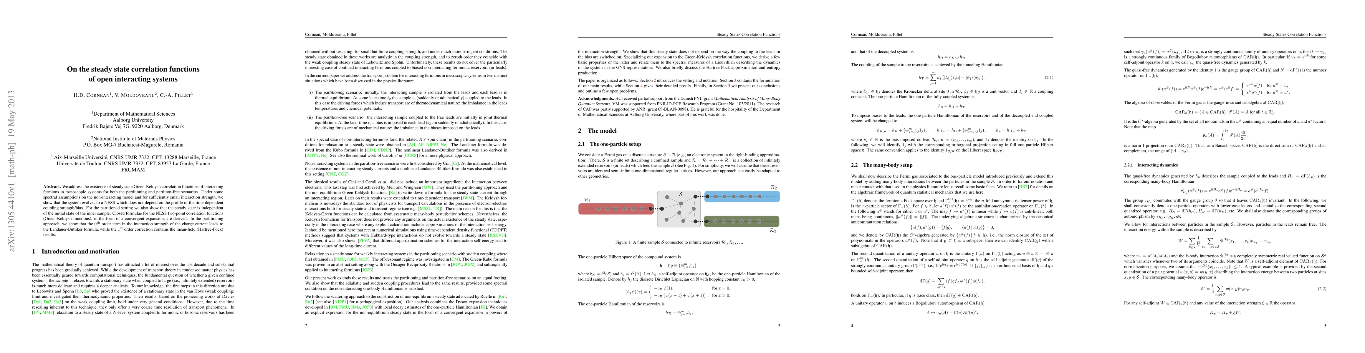 We address the existence of steady state Green-Keldysh correlation functions of interacting fermions in mesoscopic systems for both the partitioning and partition-free scenarios. Under some spectral assumptions on the non-interacting model and for sufficiently small interaction strength, we show that the system evolves to a NESS which does not depend on the profile of the time-dependent coupling strength/bias. For the partitioned setting we also show that the steady state is independent of the initial state of the inner sample. Closed formulae for the NESS two-point correlation functions (Green-Keldysh functions), in the form of a convergent expansion, are derived. In the partitioning approach, we show that the 0th order term in the interaction strength of the charge current leads to the Landauer-Buettiker formula, while the 1st order correction contains the mean-field (Hartree-Fock) results.