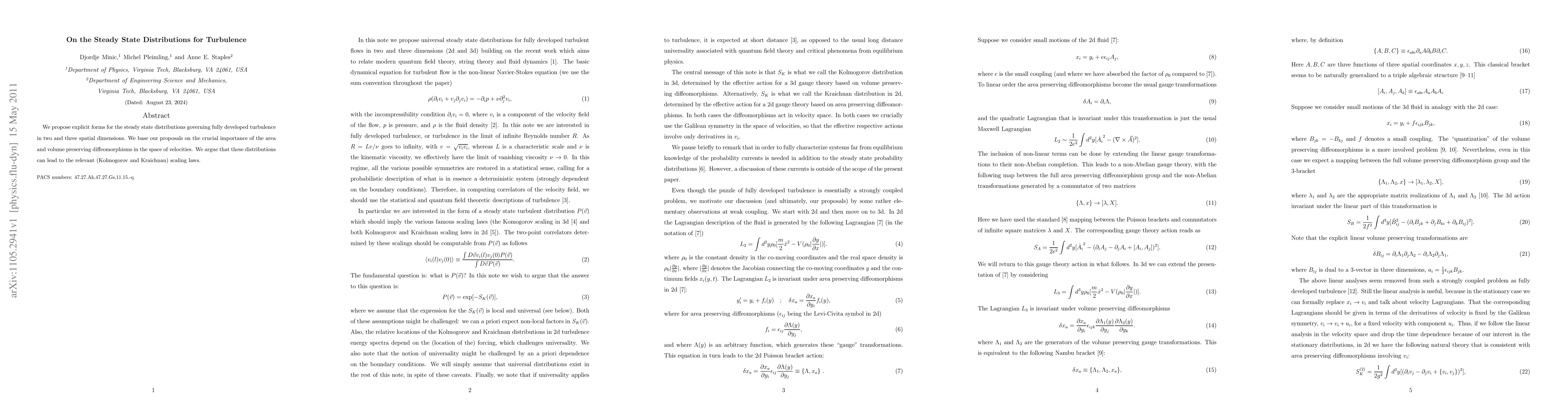We propose explicit forms for the steady state distributions governing fully developed turbulence in two and three spatial dimensions. We base our proposals on the crucial importance of the area and volume preserving diffeomorphisms in the space of velocities. We argue that these distributions can lead to the relevant (Kolmogorov and Kraichnan) scaling laws.