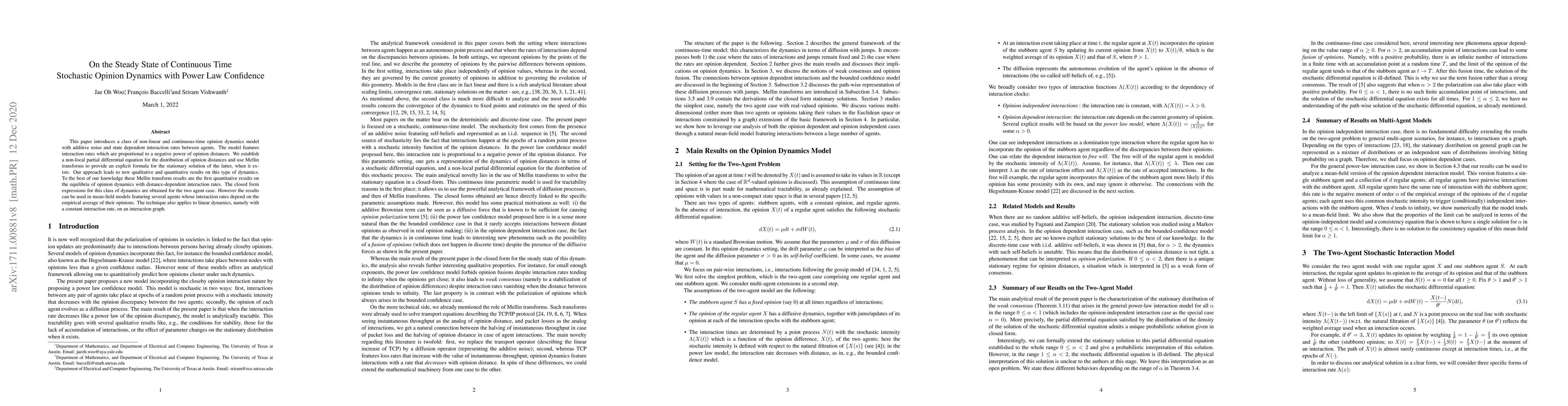 This paper introduces a continuous-time opinion dynamics model with power-law confidence, establishing a new framework for studying equilibria of social interactions. It derives explicit formulas for stationary solutions using Mellin transforms, providing novel insights into the behavior of such systems.