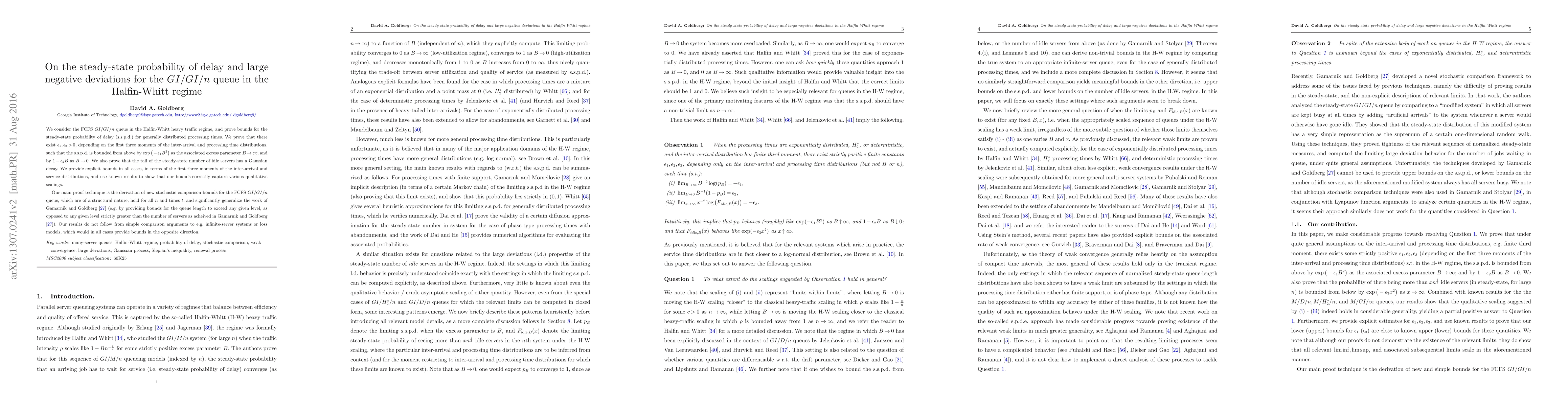 We consider the FCFS $GI/GI/n$ queue in the Halfin-Whitt heavy traffic regime, and prove bounds for the steady-state probability of delay (s.s.p.d.) for generally distributed processing times. We prove that there exist $\epsilon_1, \epsilon_2 > 0$, depending on the first three moments of the inter-arrival and processing time distributions, such that the s.s.p.d. is bounded from above by $\exp\big(-\epsilon_1 B^2\big)$ as the associated excess parameter $B \rightarrow \infty$; and by $1 - \epsilon_2 B$ as $B \rightarrow 0$. We also prove that the tail of the steady-state number of idle servers has a Gaussian decay. We provide explicit bounds in all cases, in terms of the first three moments of the inter-arrival and service distributions, and use known results to show that our bounds correctly capture various qualitative scalings. \\\indent Our main proof technique is the derivation of new stochastic comparison bounds for the FCFS $GI/GI/n$ queue, which are of a structural nature, hold for all $n$ and times $t$, and significantly generalize the work of \citet{GG.10c} (e.g. by providing bounds for the queue length to exceed any given level, as opposed to any given level strictly greater than the number of servers as acheived in \citet{GG.10c}). Our results do not follow from simple comparison arguments to e.g. infinite-server systems or loss models, which would in all cases provide bounds in the opposite direction.
