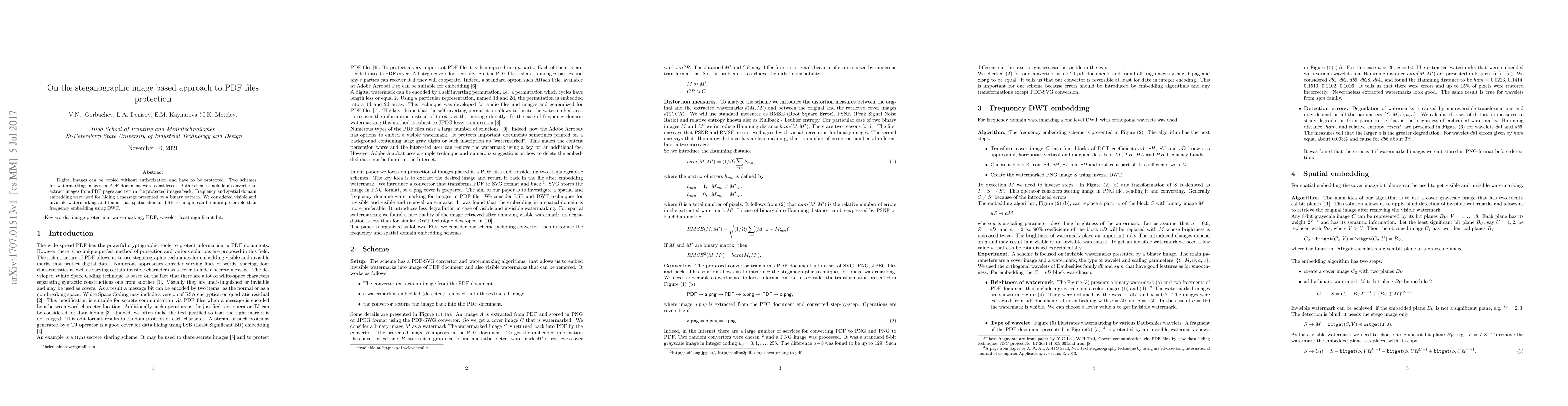 Digital images can be copied without authorization and have to be protected. Two schemes for watermarking images in PDF document were considered. Both schemes include a converter to extract images from PDF pages and return the protected images back. Frequency and spatial domain embedding were used for hiding a message presented by a binary pattern. We considered visible and invisible watermarking and found that spatial domain LSB technique can be more preferable than frequency embedding using DWT.