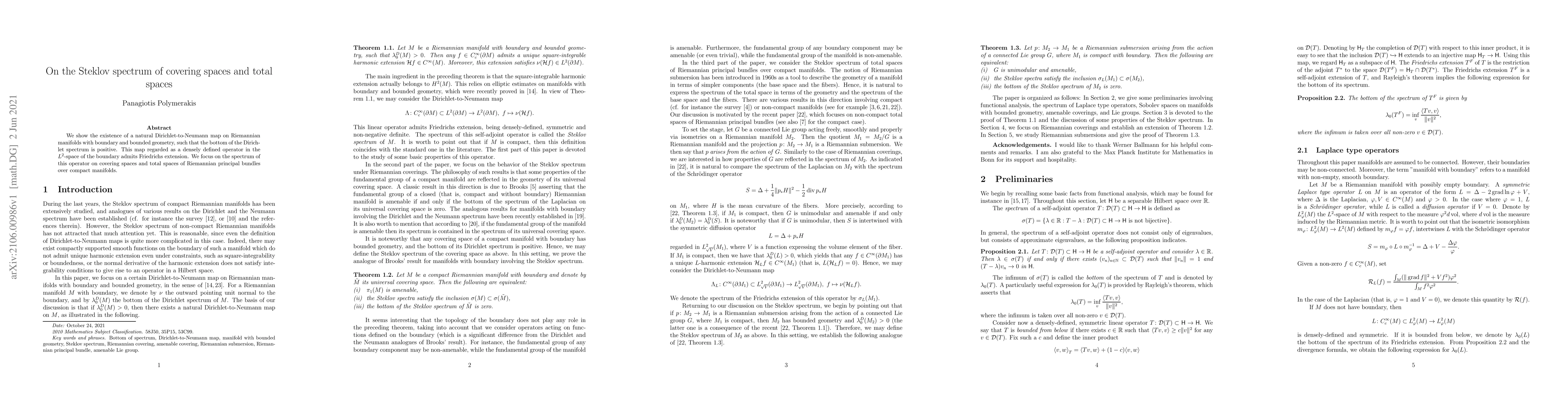 We show the existence of a natural Dirichlet-to-Neumann map on Riemannian manifolds with boundary and bounded geometry, such that the bottom of the Dirichlet spectrum is positive. This map regarded as a densely defined operator in the $L^2$-space of the boundary admits Friedrichs extension. We focus on the spectrum of this operator on covering spaces and total spaces of Riemannian principal bundles over compact manifolds.