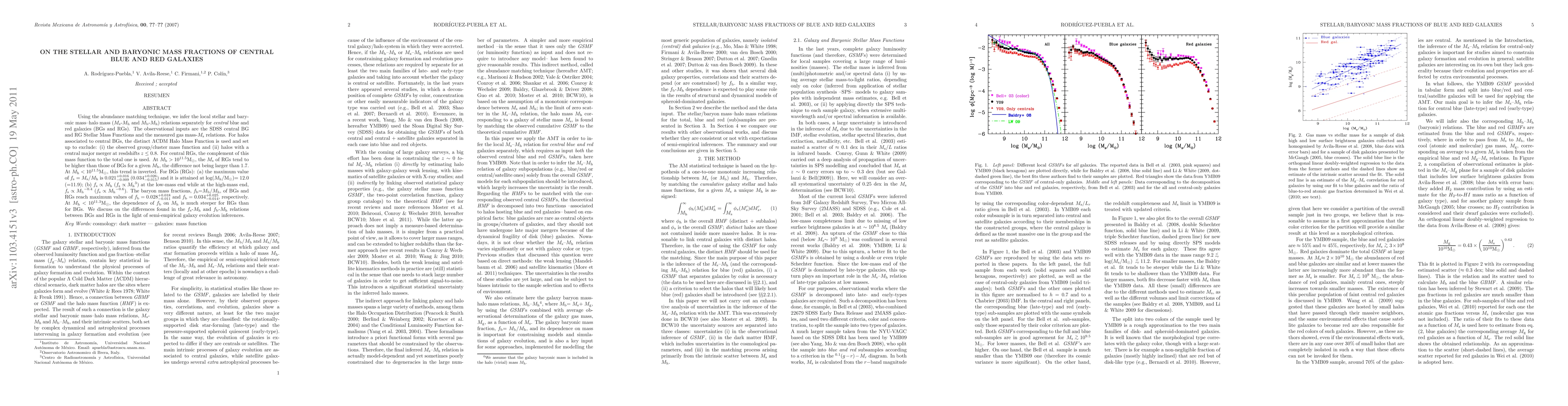 This paper investigates the stellar and baryonic mass fractions of central blue and red galaxies using the abundance matching technique. It finds that while the mean stellar-to-halo mass and baryonic-to-halo mass relations for blue and red galaxies are similar, red galaxies tend to have higher stellar mass than blue ones for halo masses above 10^11.5 Msun, with differences in mass fractions explained through semi-empirical galaxy models.