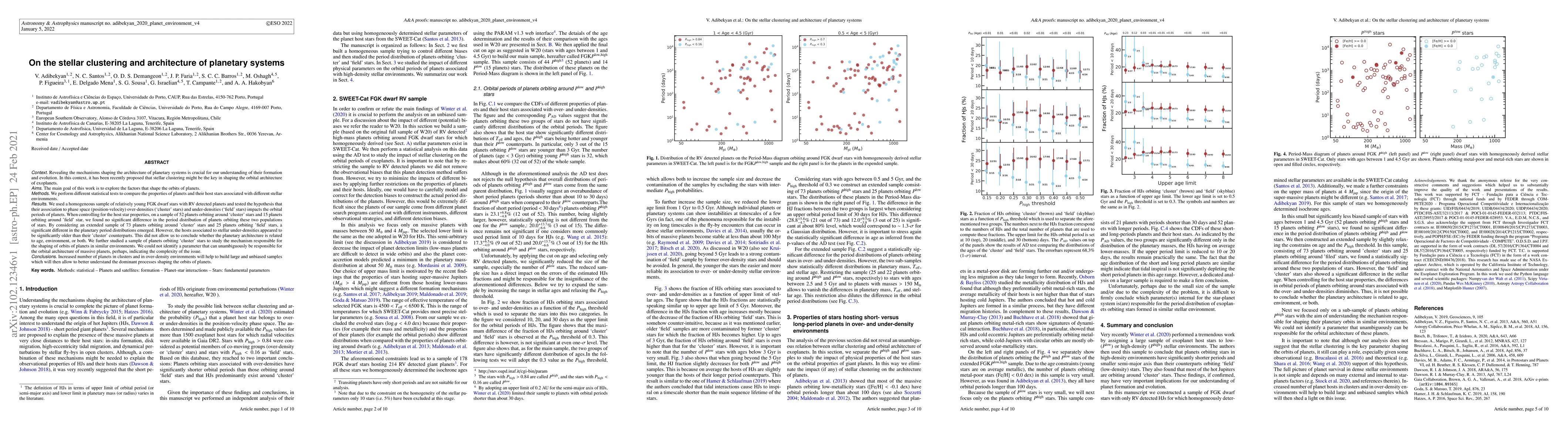 Revealing the mechanisms shaping the architecture of planetary systems is crucial for our understanding of their formation and evolution. In this context, it has been recently proposed that stellar clustering might be the key in shaping the orbital architecture of exoplanets. The main goal of this work is to explore the factors that shape the orbits of planets. We used a homogeneous sample of relatively young FGK dwarf stars with RV detected planets and tested the hypothesis that their association to phase space (position-velocity) over-densities ('cluster' stars) and under-densities ('field' stars) impacts the orbital periods of planets. When controlling for the host star properties, on a sample of 52 planets orbiting around 'cluster' stars and 15 planets orbiting around 'field' star, we found no significant difference in the period distribution of planets orbiting these two populations of stars. By considering an extended sample of 73 planets orbiting around 'cluster' stars and 25 planets orbiting 'field' stars, a significant different in the planetary period distributions emerged. However, the hosts associated to stellar under-densities appeared to be significantly older than their 'cluster' counterparts. This did not allow us to conclude whether the planetary architecture is related to age, environment, or both. We further studied a sample of planets orbiting 'cluster' stars to study the mechanism responsible for the shaping of orbits of planets in similar environments. We could not identify a parameter that can unambiguously be responsible for the orbital architecture of massive planets, perhaps, indicating the complexity of the issue. Conclusions. Increased number of planets in clusters and in over-density environments will help to build large and unbiased samples which will then allow to better understand the dominant processes shaping the orbits of planets.