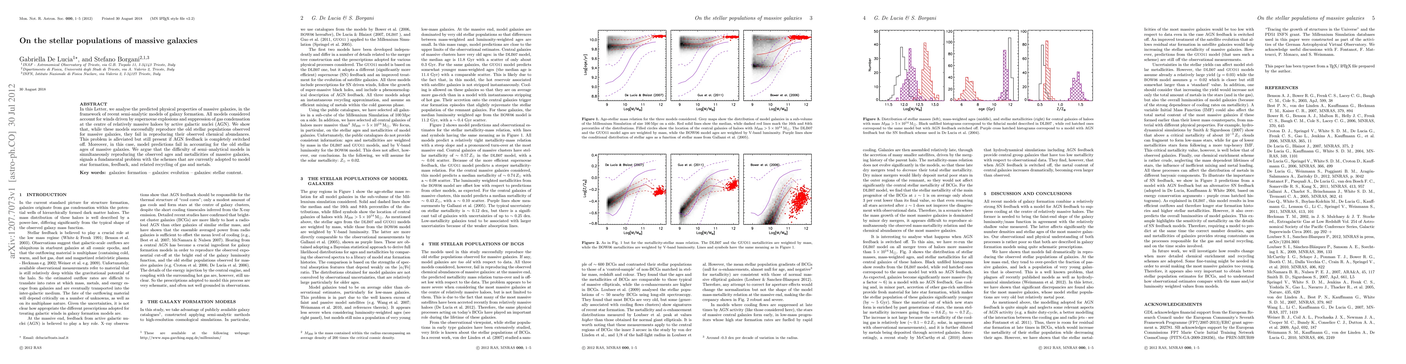 In this Letter, we analyse the predicted physical properties of massive galaxies, in the framework of recent semi-analytic models of galaxy formation. All models considered account for winds driven by supernovae explosions and suppression of gas condensation at the centre of relatively massive haloes by active galactic nuclei (AGN). We show that, while these models successfully reproduce the old stellar populations observed for massive galaxies, they fail in reproducing their observed chemical abundances. This problem is alleviate but still present if AGN feedback is completely switched off. Moreover, in this case, model predictions fail in accounting for the old stellar ages of massive galaxies. We argue that the difficulty of semi-analytical models in simultaneously reproducing the observed ages and metallicities of massive galaxies, signals a fundamental problem with the schemes that are currently adopted to model star formation, feedback, and related recycling of gas and metals.