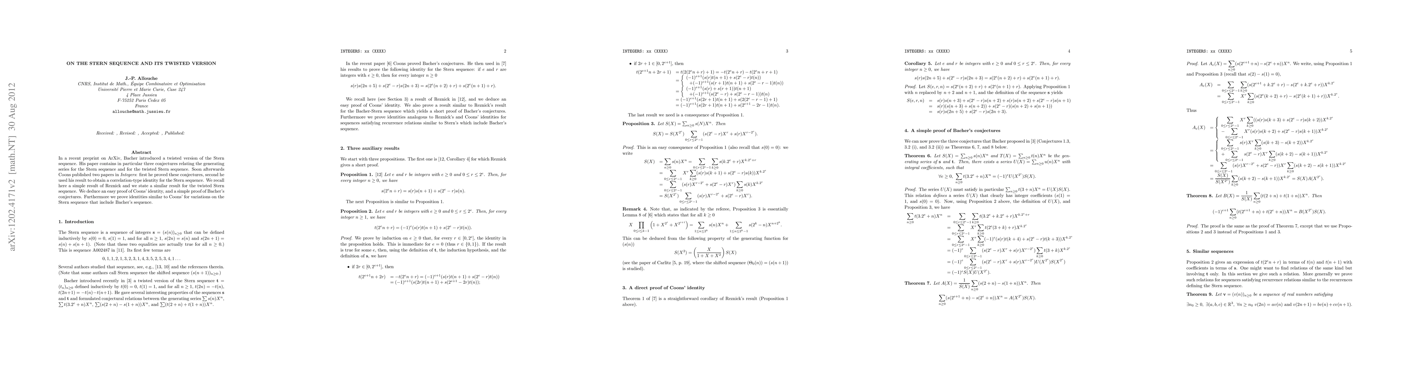 In a recent preprint on ArXiv, Bacher introduced a twisted version of the Stern sequence. His paper contains in particular three conjectures relating the generating series for the Stern sequence and for the twisted Stern sequence. Soon afterwards Coons published two papers in {\it Integers}: first he proved these conjectures, second he used his result to obtain a correlation-type identity for the Stern sequence. We recall here a simple result of Reznick and we state a similar result for the twisted Stern sequence. We deduce an easy proof of Coons' identity, and a simple proof of Bacher's conjectures. Furthermore we prove identities similar to Coons' for variations on the Stern sequence that include Bacher's sequence.