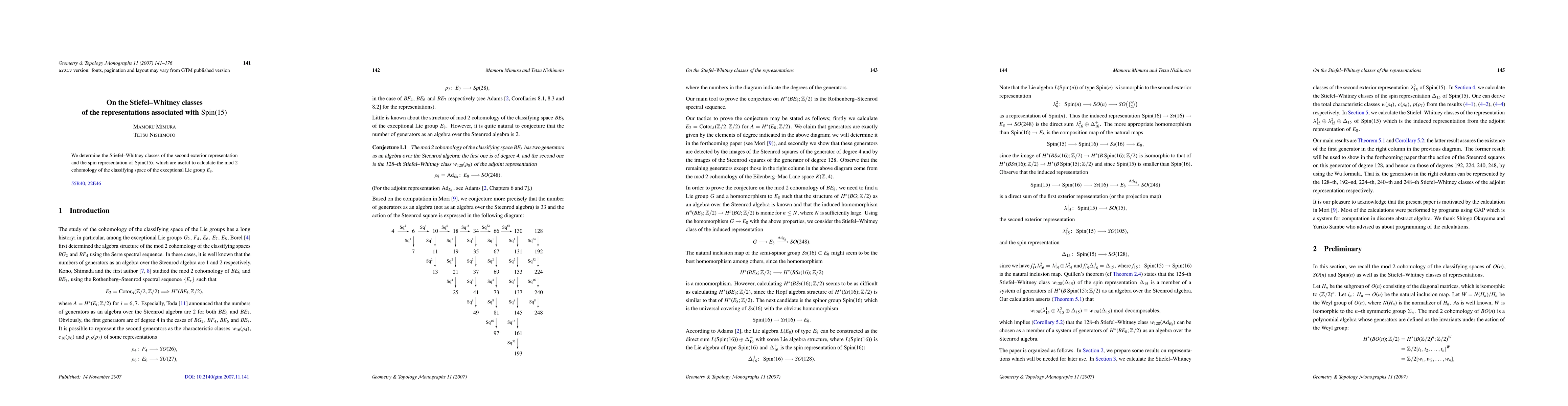 Summary: The paper determines the Stiefel-Whitney classes for the second exterior and spin representations of Spin(15), providing essential data for calculating the mod 2 cohomology of the classifying space of the exceptional Lie group E_8.