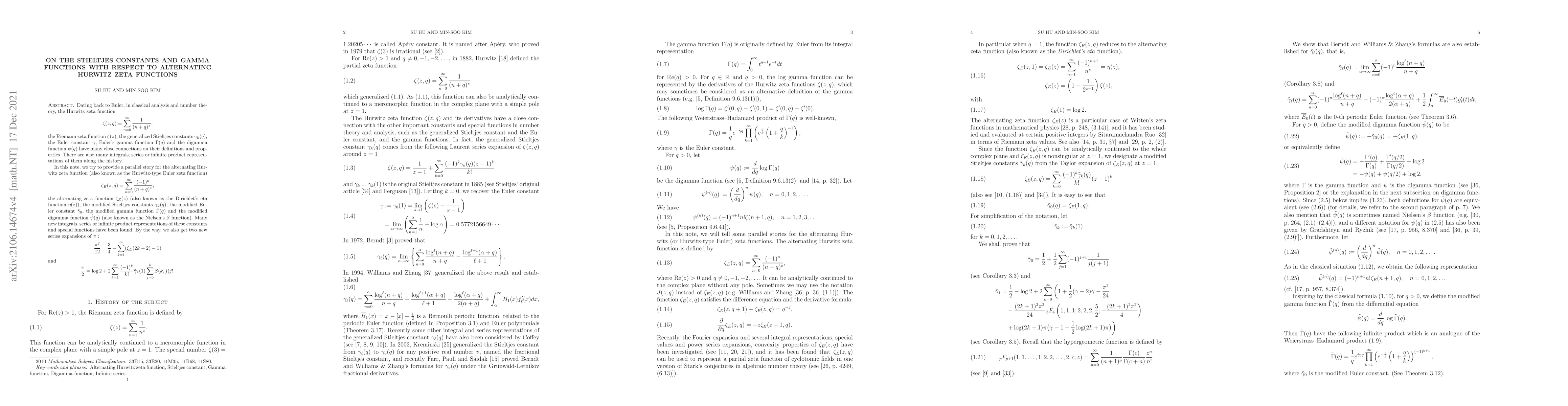This paper explores the connections between the alternating Hurwitz zeta function and its associated constants and functions, including modified Stieltjes constants, Euler's gamma function, and the digamma function. It presents new series expansions for $\pi$ and introduces various integrals, series, and infinite product representations for these special functions.