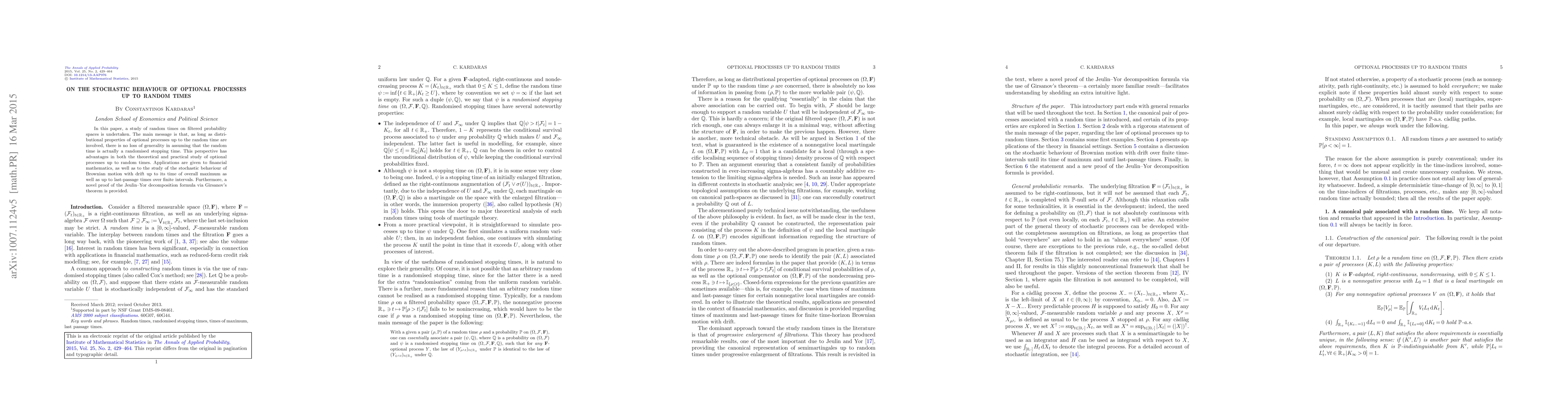 This paper explores the stochastic behavior of optional processes up to random times, demonstrating that assuming random times as randomised stopping times does not lose generality. It applies these insights to financial mathematics and the analysis of Brownian motion, and provides a new proof for the Jeulin-Yor decomposition formula using Girsanov's theorem.
