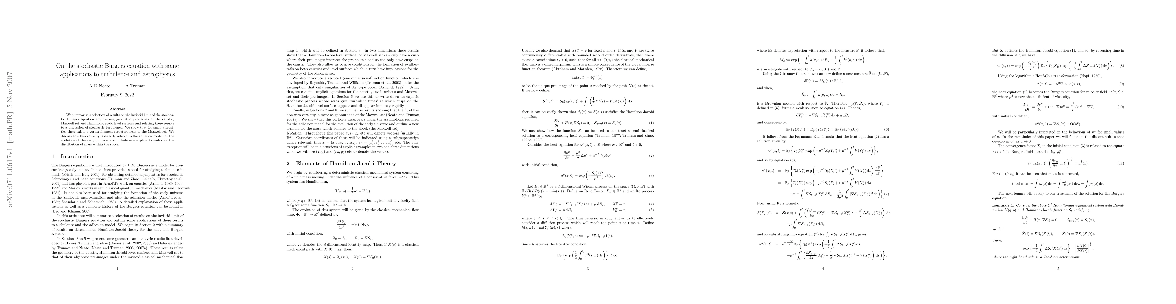 We summarise a selection of results on the inviscid limit of the stochastic Burgers equation emphasising geometric properties of the caustic, Maxwell set and Hamilton-Jacobi level surfaces and relating these results to a discussion of stochastic turbulence. We show that for small viscosities there exists a vortex filament structure near to the Maxwell set. We discuss how this vorticity is directly related to the adhesion model for the evolution of the early universe and include new explicit formulas for the distribution of mass within the shock.