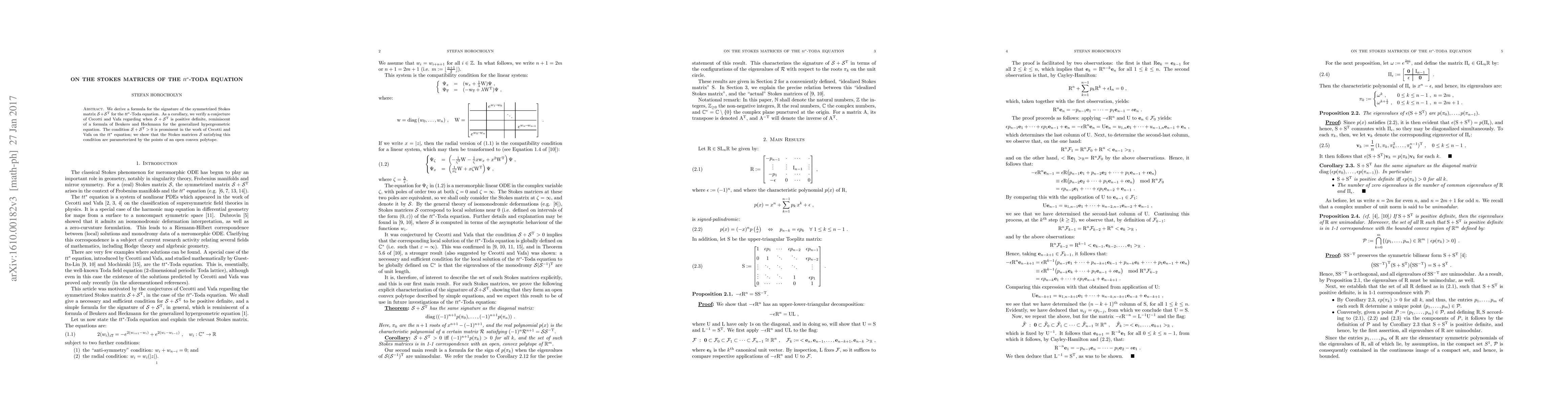 This paper derives a formula for the signature of the symmetrized Stokes matrix for the $tt^*$-Toda equation and verifies a conjecture by Cecotti and Vafa on when this matrix is positive definite, linking it to a similar result in the generalized hypergeometric equation. The study reveals that Stokes matrices meeting this condition are parameterized by points within an open convex polytope.