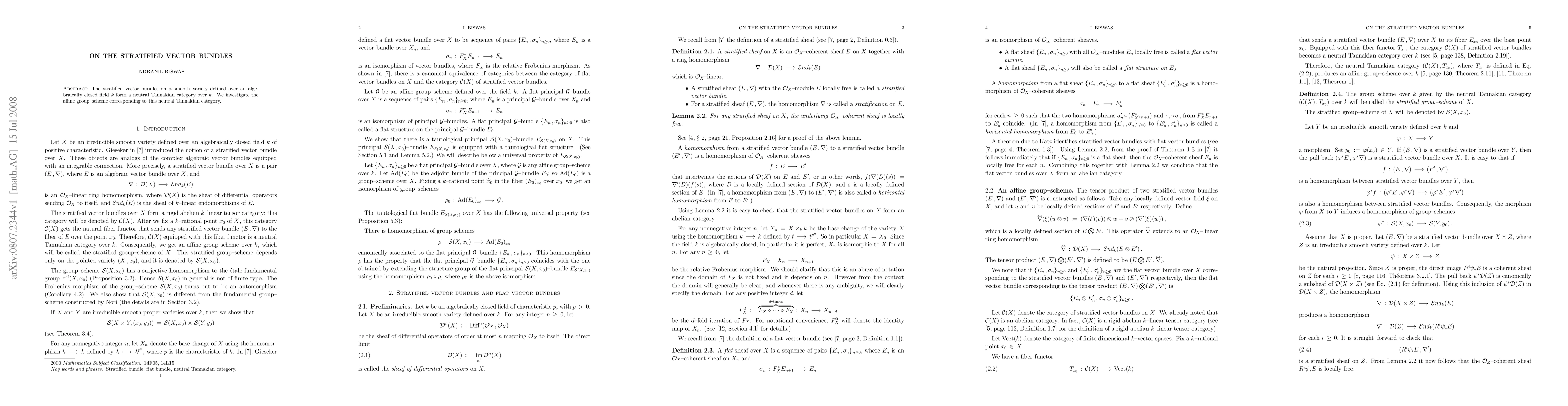 Summary: This paper explores the neutral Tannakian category formed by stratified vector bundles on smooth varieties over an algebraically closed field, and identifies the affine group-scheme associated with this category.