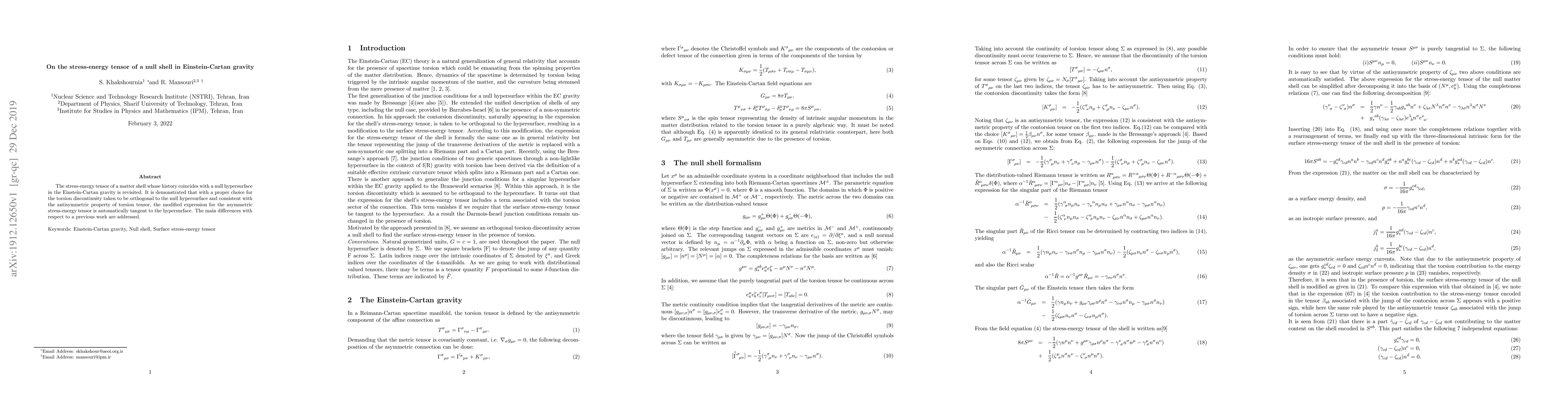 The stress-energy tensor of a matter shell whose history coincides with a null hypersurface in the Einstein-Cartan gravity is revisited. It is demonstrated that with a proper choice for the torsion discontinuity taken to be orthogonal to the null hypersurface and consistent with the antisymmetric property of torsion tensor, the modified expression for the asymmetric stress-energy tensor is automatically tangent to the hypersurface. The main differences with respect to a previous work are addressed