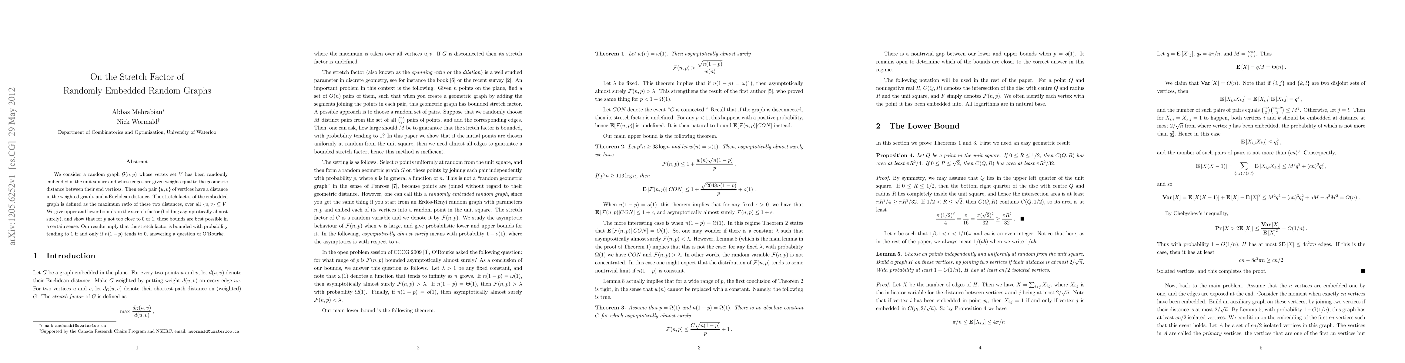This paper investigates the stretch factor in randomly embedded random graphs, determining upper and lower bounds for the maximum ratio of weighted graph distances to Euclidean distances. It concludes that the stretch factor is asymptotically bounded if and only if the product of the number of vertices and (1-p) tends to zero, resolving a question posed by O'Rourke.