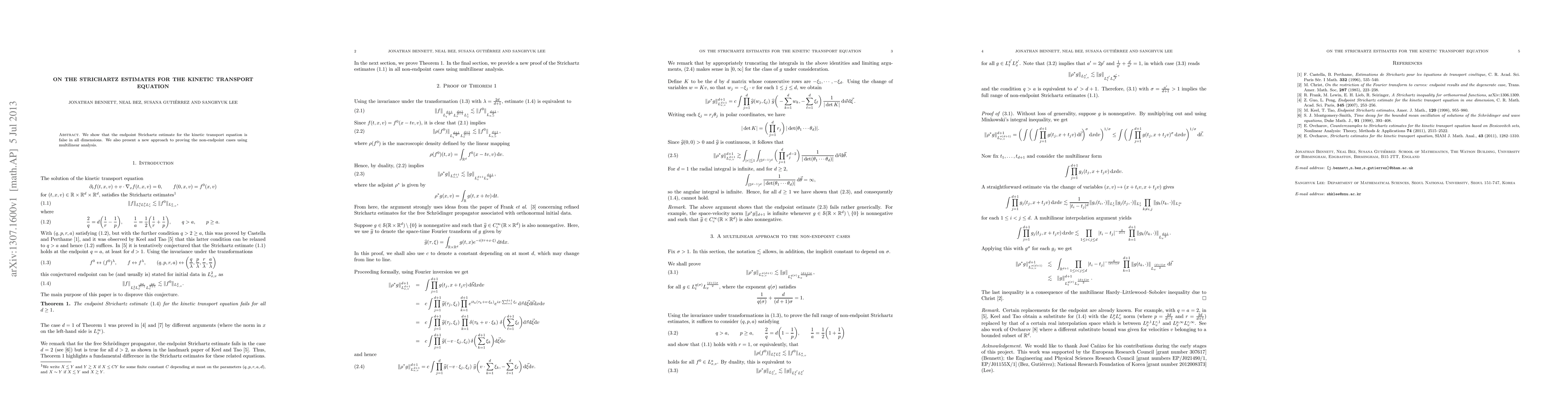 Summary: This paper demonstrates that the endpoint Strichartz estimate for the kinetic transport equation does not hold in any dimension. It introduces a novel multilinear analysis method for proving non-endpoint cases.
