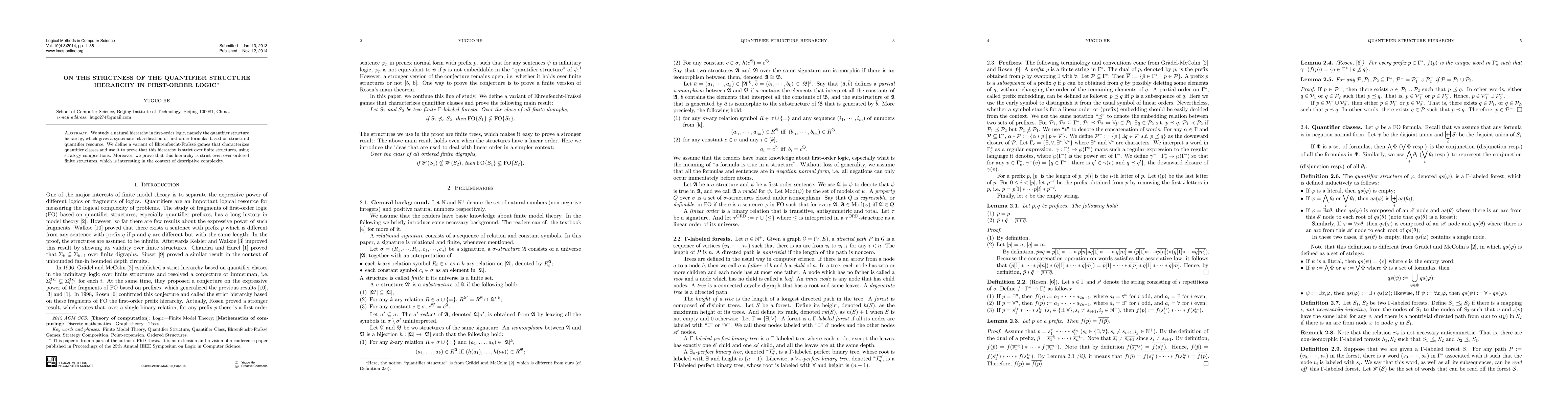 This paper studies the quantifier structure hierarchy in first-order logic, proving its strictness over finite structures using Ehrenfeucht-Fraisse games and strategy compositions. The results have implications for descriptive complexity.