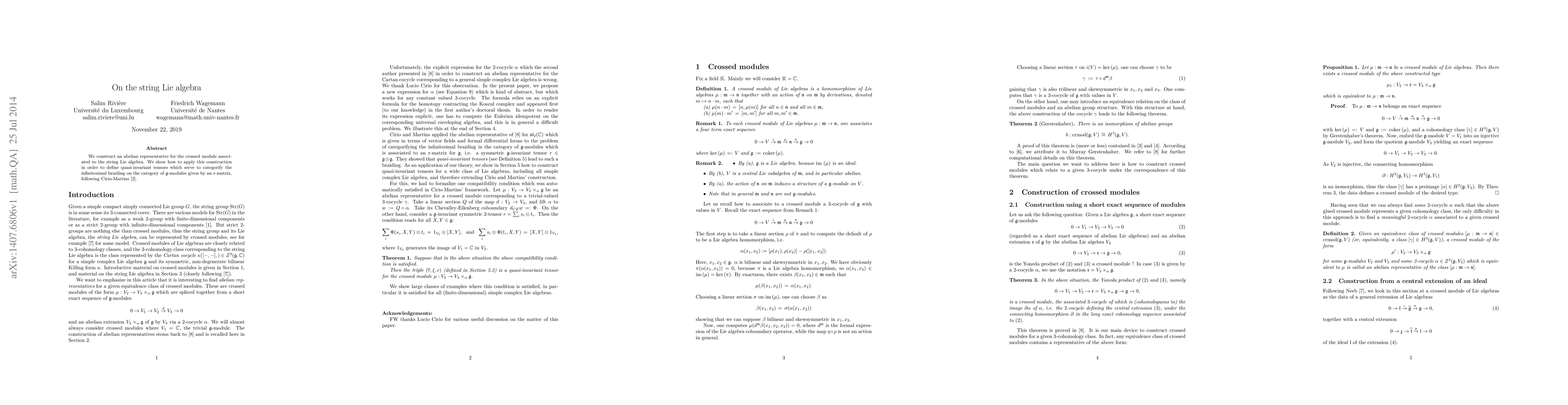 The paper constructs an abelian representative for the crossed module associated with the string Lie algebra, utilizing a contracting homotopy to lift 3-cocycles with values in C⁴.
