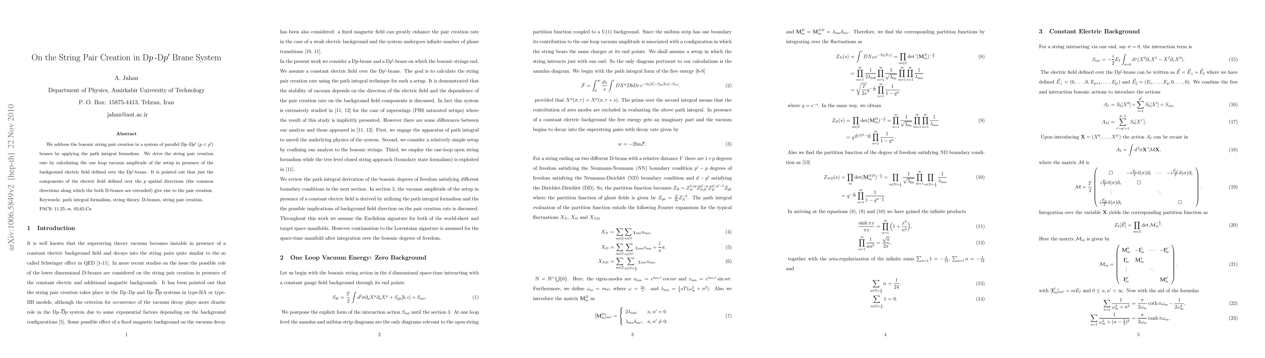 We address the bosonic string pair creation in a system of parallel Dp-Dp' (p
