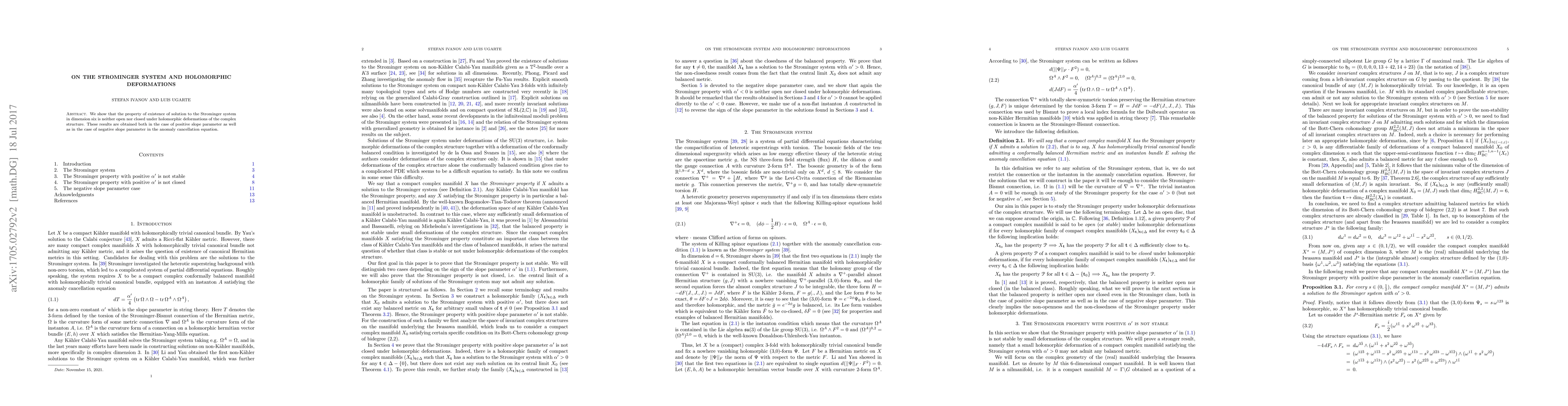 We show that the property of existence of solution to the Strominger system in dimension six is neither open nor closed under holomorphic deformations of the complex structure. These results are obtained both in the case of positive slope parameter as well as in the case of negative slope parameter in the anomaly cancellation equation.