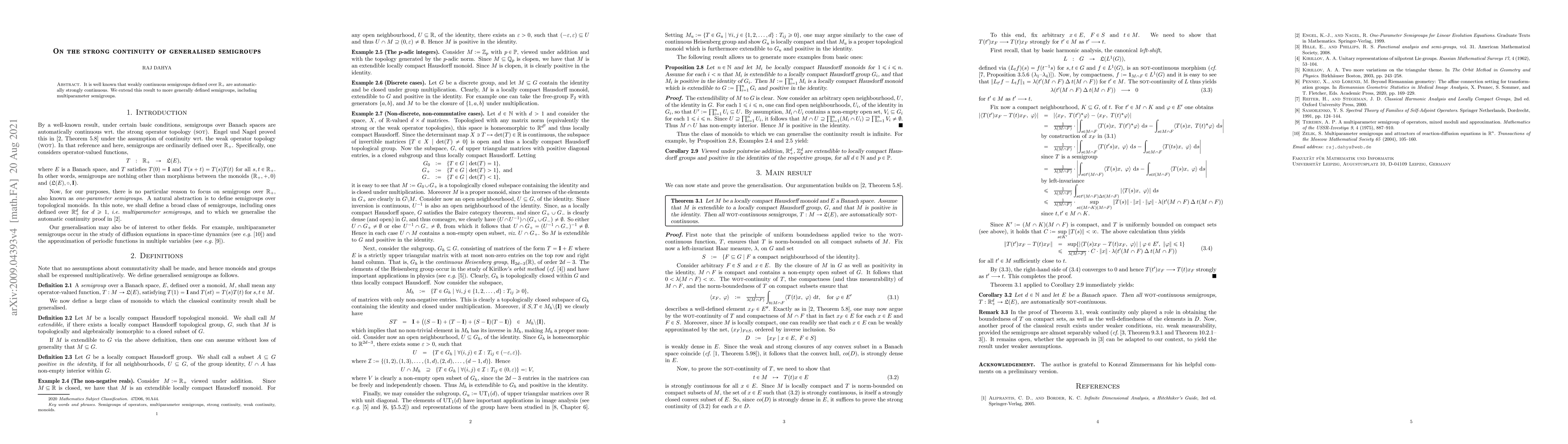 It is well known that weakly continuous semigroups defined over $\mathbb{R}_{+}$ are automatically strongly continuous. We extend this result to more generally defined semigroups, including multiparameter semigroups.