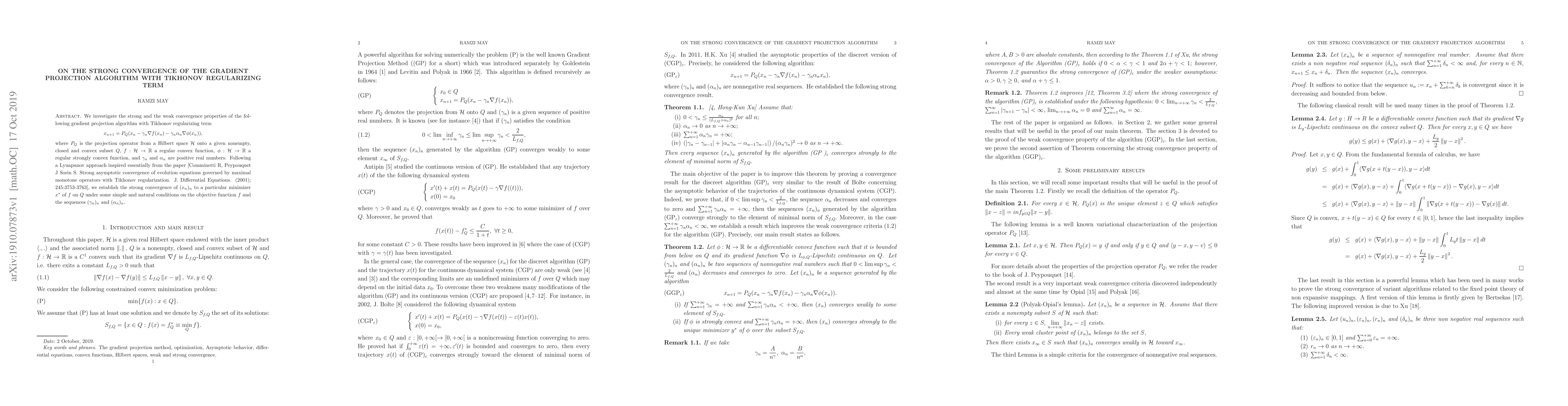 We investigate the strong and the weak convergence properties of the following gradient projection algorithm with Tikhonov regularizing term \[ x_{n+1}=P_{Q}(x_{n}-\gamma_{n}\nabla f(x_{n})-\gamma_{n}\alpha_{n}\nabla \phi (x_{n})), \] where $P_{Q}$ is the projection operator from a Hilbert space $\mathcal{H}$ onto a given nonempty, closed and convex subset $Q,$ $f:\mathcal{H}% \rightarrow \mathbb{R}$ a regular convex function, $\phi :\mathcal{H}% \rightarrow \mathbb{R}$ a regular strongly convex function, and $\gamma_{n}$ and $\alpha_{n}$ are positive real numbers. Following a Lyuapunov approach inspired essentially from the paper [Comminetti R, Peypouquet J Sorin S. Strong asymptotic convergence of evolution equations governed by maximal monotone operators with Tikhonov regularization. J. Differential Equations. (2001); 245:3753-3763], we establish the strong convergence of $(x_{n})_{n}$ to a particular minimizer $x^{\ast }$ of $f$ on $Q$ under some simple and natural conditions on the objective function $f$\ and the sequences $(\gamma_{n})_{n}$ and $(\alpha_{n})_{n}$