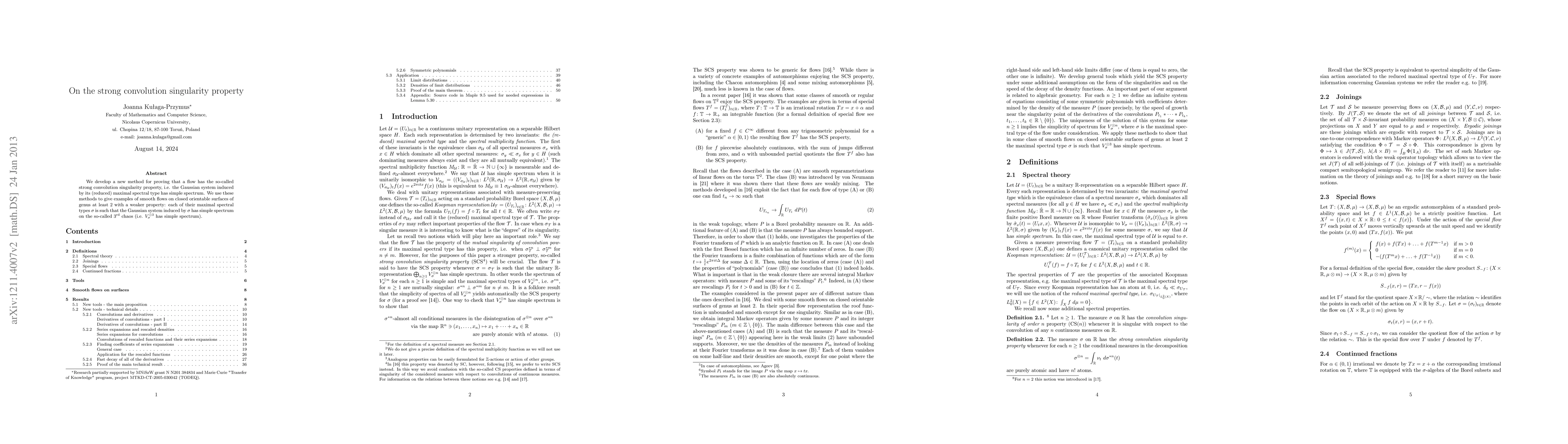 We develop a new method for proving that a flow has the so-called strong convolution singularity property, i.e. the Gaussian system induced by its (reduced) maximal spectral type has simple spectrum. We use these methods to give examples of smooth flows on closed orientable surfaces of genus at least 2 with a weaker property: each of their maximal spectral types $\sigma$ is such that the Gaussian system induced by $\sigma$ has simple spectrum on the so-called 3rd chaos (i.e. $V_\sigma^{\odot 3}$ has simple spectrum).