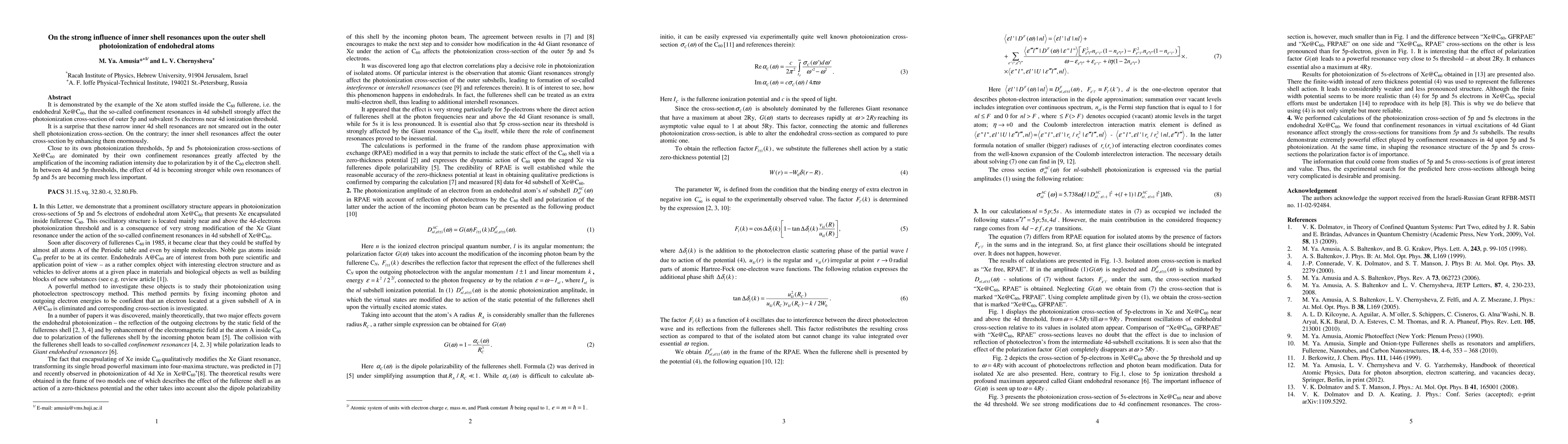 It is demonstrated by the example of the Xe atom stuffed inside the C60 fullerene, that the so-called confinement resonances in 4d subshell strongly affect the photoionization cross-section of outer 5p and subvalent 5s electrons near 4d ionization threshold. It is a surprise that these narrow inner 4d shell resonances are not smeared out in the outer shell photoionization cross-section. On the contrary; the inner shell resonances affect the outer cross-section by enhancing them enormously. Close to its own photoionization thresholds, 5p and 5s photoionization cross-sections of Xe endohedral are dominated by their own confinement resonances greatly affected by the amplification of the incoming radiation intensity due to polarization by it of the C60 electron shell. In between 4d and 5p thresholds, the effect of 4d is becoming stronger while own resonances of 5p and 5s are becoming much less important.