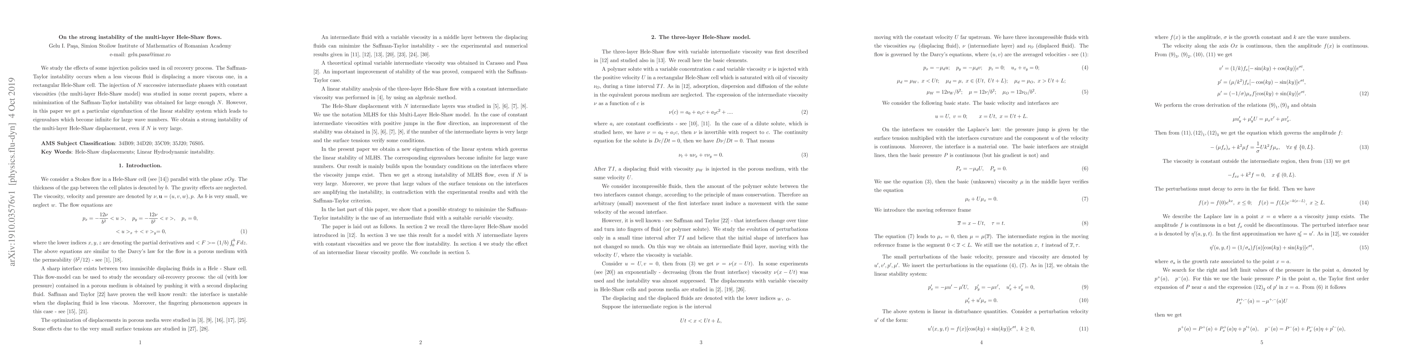 This paper investigates the Saffman-Taylor instability in multi-layer Hele-Shaw flows during oil recovery, revealing that even with many intermediate phases, the displacement can exhibit strong instability due to a particular eigenfunction leading to infinite eigenvalues for large wave numbers.