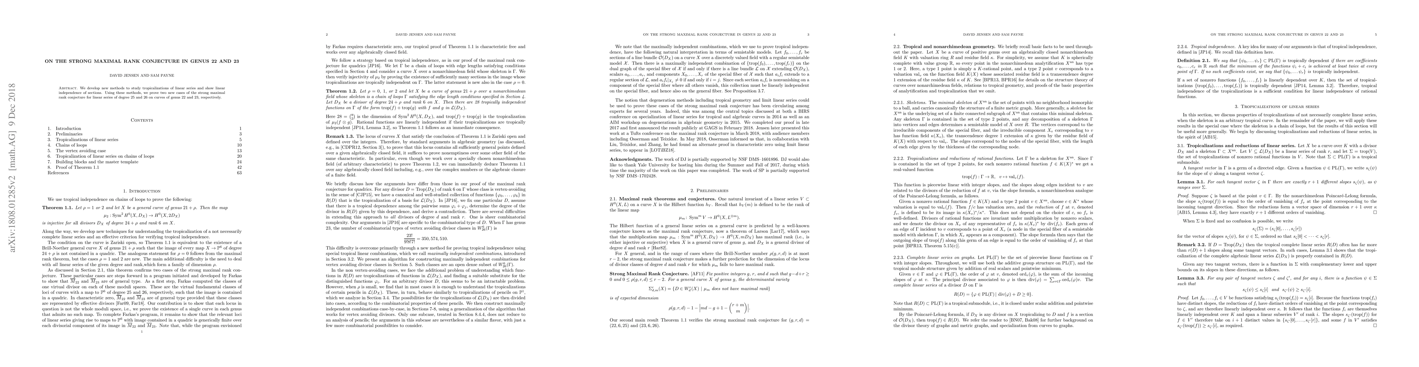 The paper develops new methods to study tropicalizations of linear series and proves linear independence of sections, leading to the proof of two new cases of the strong maximal rank conjecture for linear series of degree 25 and 26 on curves of genus 22 and 23, respectively.
