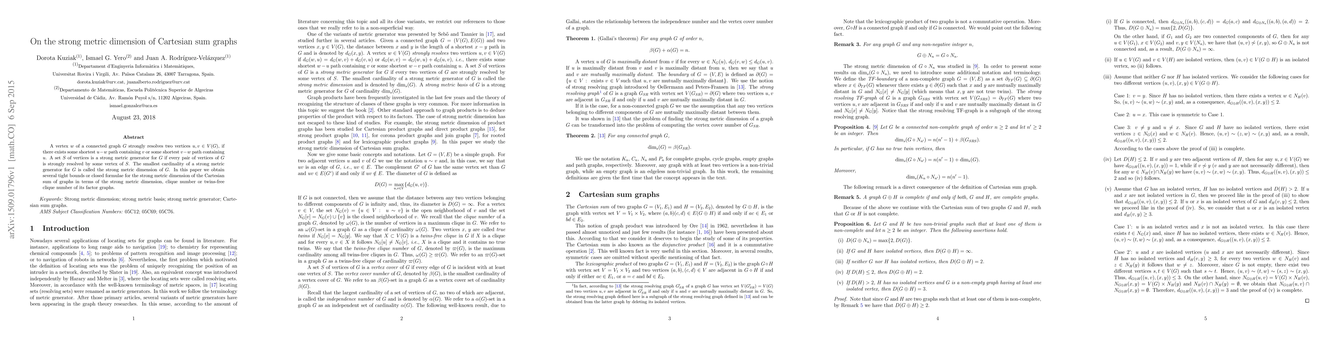 The paper analyzes the strong metric dimension of Cartesian sum graphs by obtaining tight bounds or closed formulas in terms of the strong metric dimension, clique number, or twins-free clique number of factor graphs.