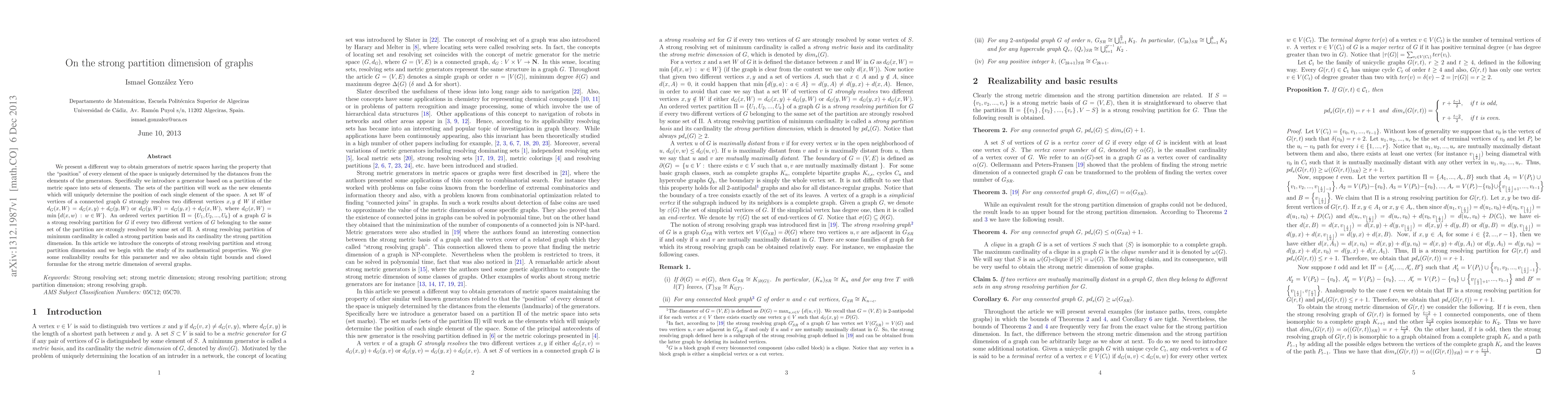 We present a different way to obtain generators of metric spaces having the property that the ``position'' of every element of the space is uniquely determined by the distances from the elements of the generators. Specifically we introduce a generator based on a partition of the metric space into sets of elements. The sets of the partition will work as the new elements which will uniquely determine the position of each single element of the space. A set $W$ of vertices of a connected graph $G$ strongly resolves two different vertices $x,y\notin W$ if either $d_G(x,W)=d_G(x,y)+d_G(y,W)$ or $d_G(y,W)=d_G(y,x)+d_G(x,W)$, where $d_G(x,W)=\min\left\{d(x,w)\;:\;w\in W\right\}$. An ordered vertex partition $\Pi=\left\{U_1,U_2,...,U_k\right\}$ of a graph $G$ is a strong resolving partition for $G$ if every two different vertices of $G$ belonging to the same set of the partition are strongly resolved by some set of $\Pi$. A strong resolving partition of minimum cardinality is called a strong partition basis and its cardinality the strong partition dimension. In this article we introduce the concepts of strong resolving partition and strong partition dimension and we begin with the study of its mathematical properties. We give some realizability results for this parameter and we also obtain tight bounds and closed formulae for the strong metric dimension of several graphs.
