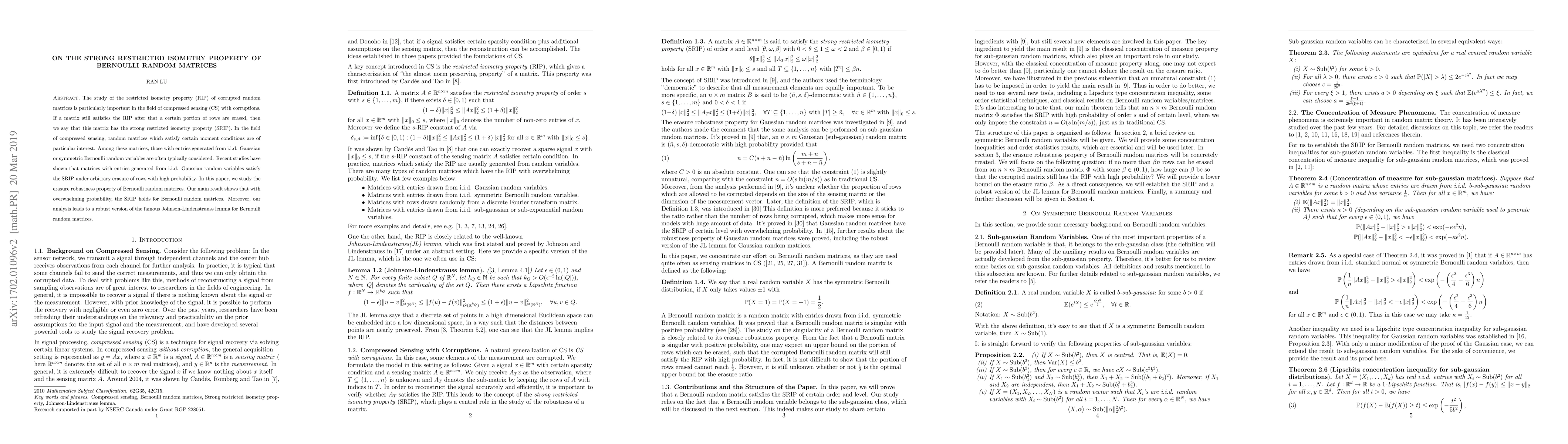 This paper investigates the strong restricted isometry property (SRIP) of Bernoulli random matrices in the context of compressed sensing with row erasures. It demonstrates that Bernoulli random matrices maintain the SRIP with high probability, even after significant row corruptions, and extends the Johnson-Lindenstrauss lemma for these matrices.