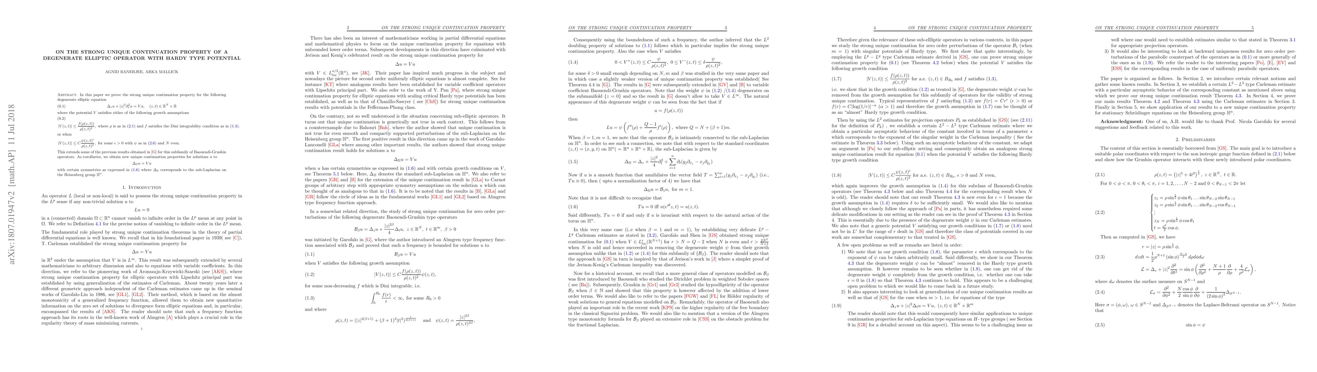 In this paper we prove strong unique continuation for the following degenerate elliptic equation \begin{equation}\label{e0} \Delta_zu +|z|^2\partial_t^2u = Vu,\quad (z,t) \in \mathbb{R}^N \times \mathbb{R} \end{equation} where the potential $V$ satisfies either of the following growth assumptions \begin{align} & |V(z,t)| \leq \frac{f(\rho(z,t))}{\rho(z,t)^2},\ \text{where $f$ satisfies the Dini integrability condition as in (1.3)} \\ & \text{or when } \notag \\ & |V(z,t)| \leq C\frac{\psi(z,t)^{\epsilon}}{\rho(z,t)^2},\ \text{for some $\epsilon>0$ with $\psi$ as in (2.6) and $N$ even.} \notag \end{align} This extends some of the previous results obtained in [G] for this subfamily of Baouendi-Grushin operators. As corollaries, we obtain new unique continuation properties for solutions $u$ to \[ \Delta_{\mathbb{H}} u = Vu \] with certain symmetries as expressed in (1.6) where $\Delta_{\mathbb{H}}$ corresponds to the sub-Laplacian on the Heisenberg group $\mathbb{H}^n$.