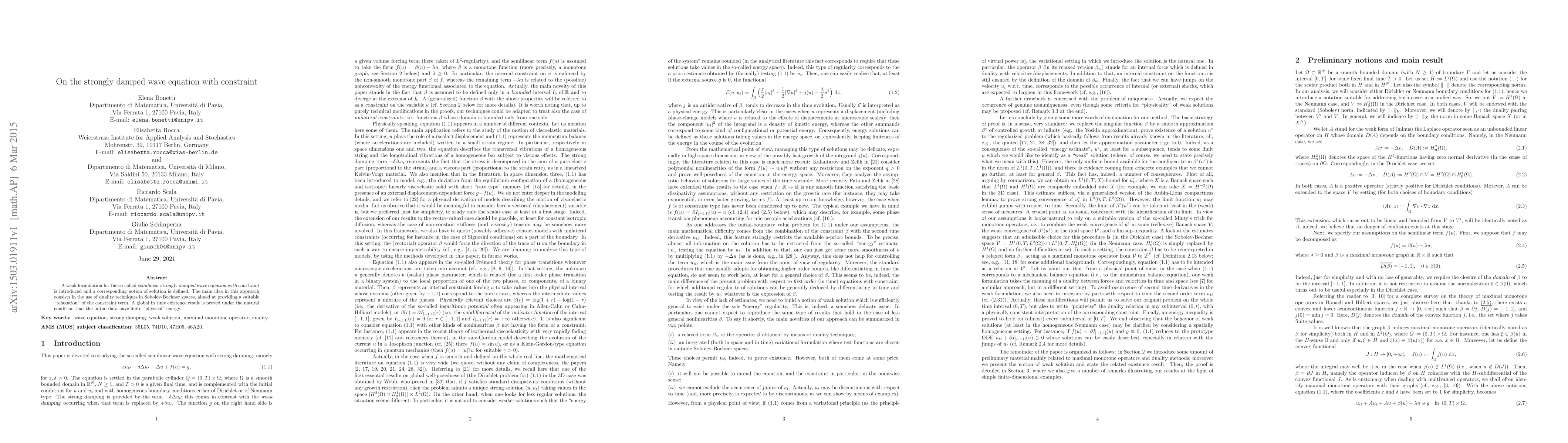 This paper introduces a weak formulation for the semilinear strongly damped wave equation with constraint, utilizing duality techniques in Sobolev-Bochner spaces to relax the constraint. It proves global existence of solutions given initial data with finite physical energy.