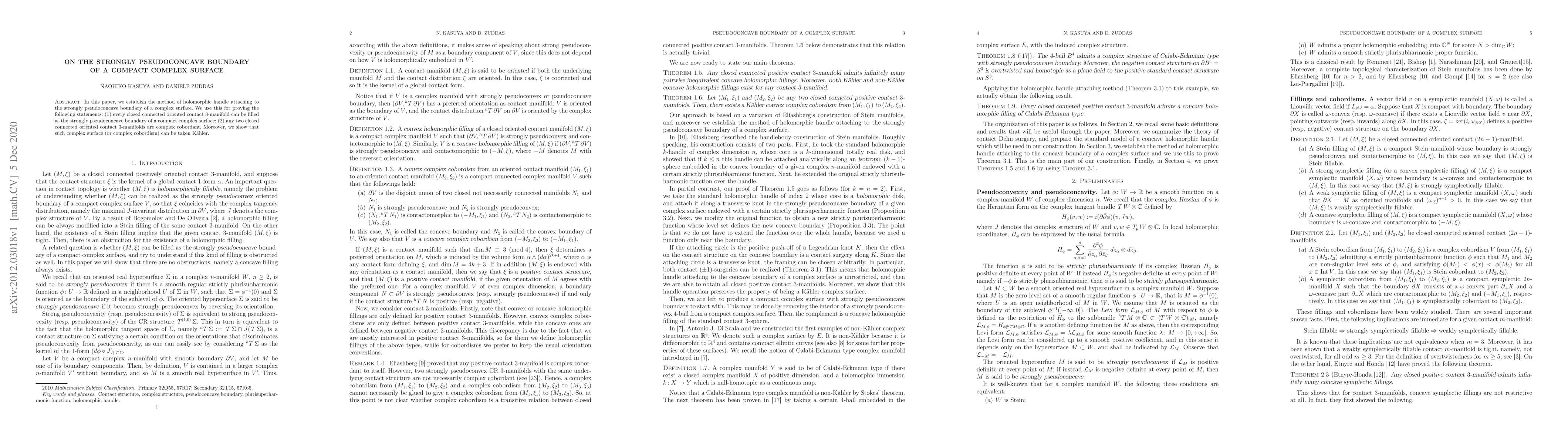 We establish the method of holomorphic handle attaching to the strongly pseudoconcave boundary of a complex surface. We use this for proving the following statements: (1) every closed connected oriented contact 3-manifold can be filled as the strongly pseudoconcave boundary of a compact complex surface; (2) any two closed connected oriented contact 3-manifolds are complex cobordant. Moreover, we show that such complex surface (or complex cobordism) can be taken K\"ahler.
