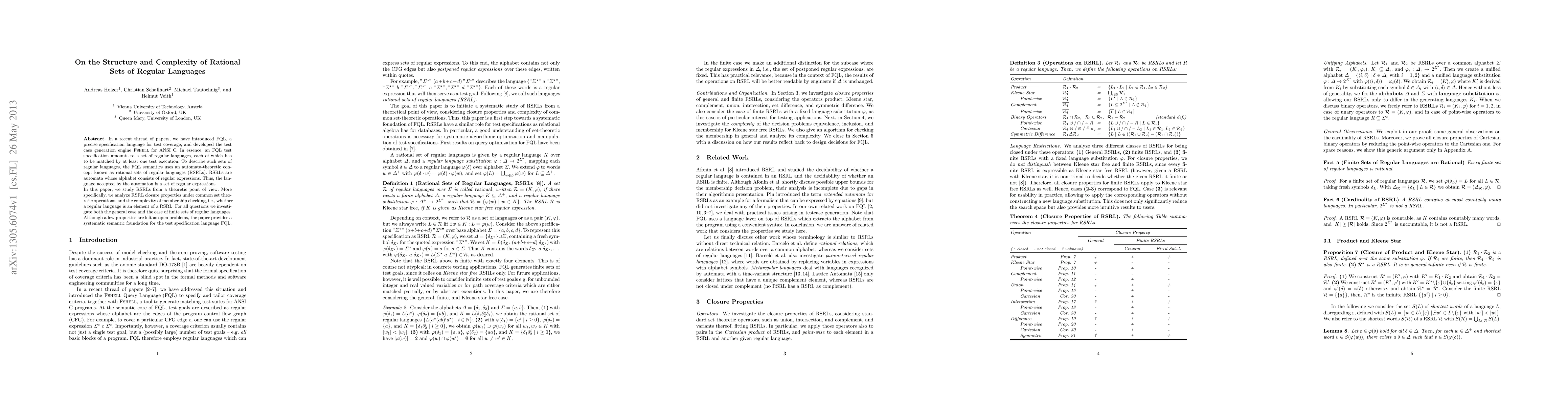 In a recent thread of papers, we have introduced FQL, a precise specification language for test coverage, and developed the test case generation engine FShell for ANSI C. In essence, an FQL test specification amounts to a set of regular languages, each of which has to be matched by at least one test execution. To describe such sets of regular languages, the FQL semantics uses an automata-theoretic concept known as rational sets of regular languages (RSRLs). RSRLs are automata whose alphabet consists of regular expressions. Thus, the language accepted by the automaton is a set of regular expressions. In this paper, we study RSRLs from a theoretic point of view. More specifically, we analyze RSRL closure properties under common set theoretic operations, and the complexity of membership checking, i.e., whether a regular language is an element of a RSRL. For all questions we investigate both the general case and the case of finite sets of regular languages. Although a few properties are left as open problems, the paper provides a systematic semantic foundation for the test specification language FQL.
