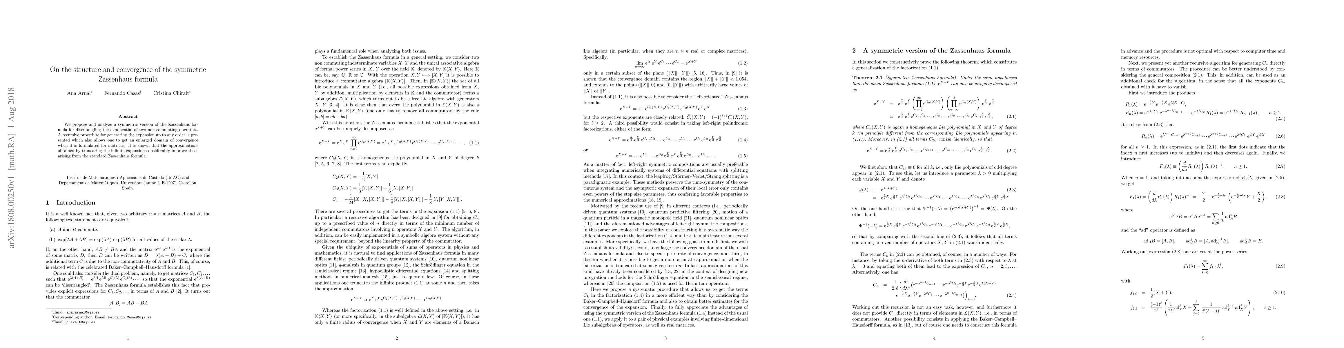 This paper introduces a symmetric version of the Zassenhaus formula to disentangle the exponential of two non-commuting operators, presenting a recursive method that enhances convergence for matrices and improves approximations compared to the standard formula.