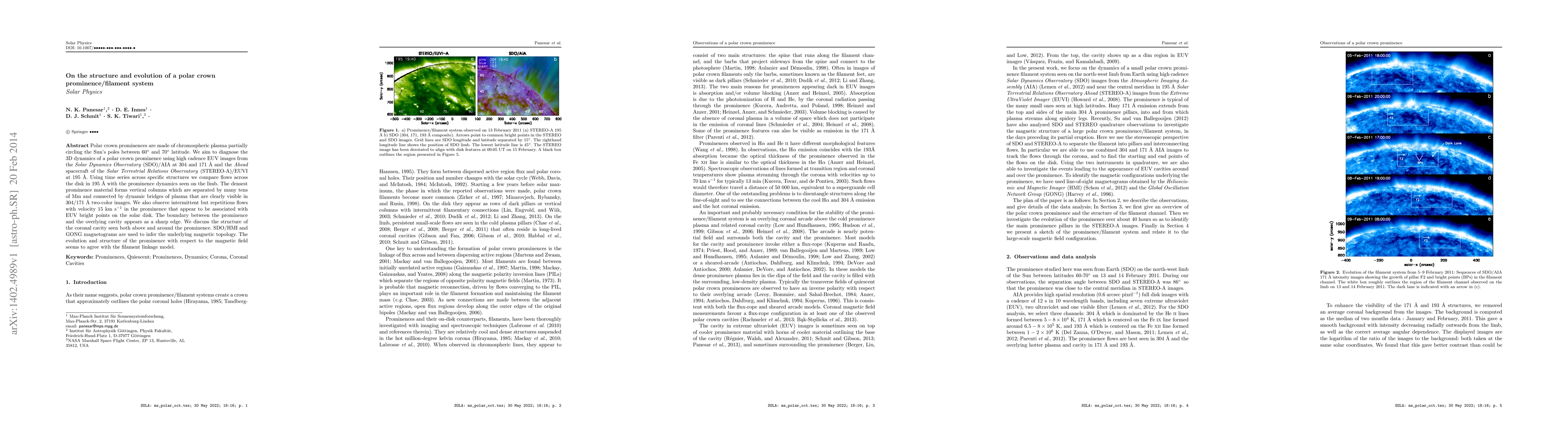 Polar crown prominences are made of chromospheric plasma partially circling the Suns poles between 60 and 70 degree latitude. We aim to diagnose the 3D dynamics of a polar crown prominence using high cadence EUV images from the Solar Dynamics Observatory (SDO)/AIA at 304 and 171A and the Ahead spacecraft of the Solar Terrestrial Relations Observatory (STEREO-A)/EUVI at 195A. Using time series across specific structures we compare flows across the disk in 195A with the prominence dynamics seen on the limb. The densest prominence material forms vertical columns which are separated by many tens of Mm and connected by dynamic bridges of plasma that are clearly visible in 304/171A two-color images. We also observe intermittent but repetitious flows with velocity 15 km/s in the prominence that appear to be associated with EUV bright points on the solar disk. The boundary between the prominence and the overlying cavity appears as a sharp edge. We discuss the structure of the coronal cavity seen both above and around the prominence. SDO/HMI and GONG magnetograms are used to infer the underlying magnetic topology. The evolution and structure of the prominence with respect to the magnetic field seems to agree with the filament linkage model.