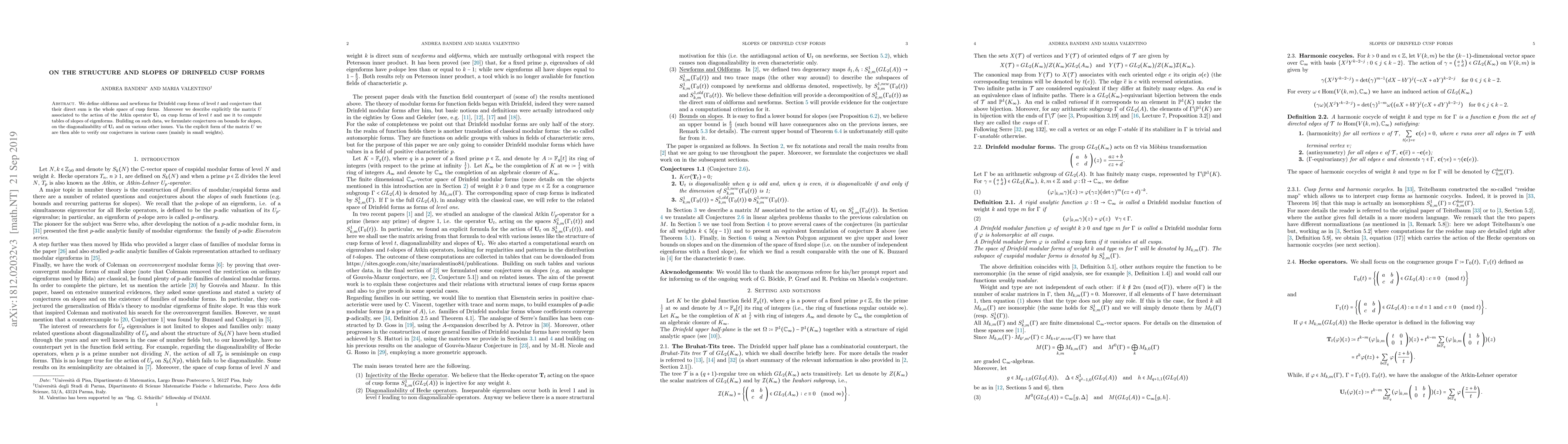This paper defines oldforms and newforms for Drinfeld cusp forms and conjectures their direct sum represents the entire space of cusp forms. It also introduces matrix $U$ for the Atkin operator $\mathbf{U}_t$ and uses it to compute slope tables of eigenforms, formulating conjectures on slope bounds and $\mathbf{U}_t$'s diagonalizability, which are verified in small weights.