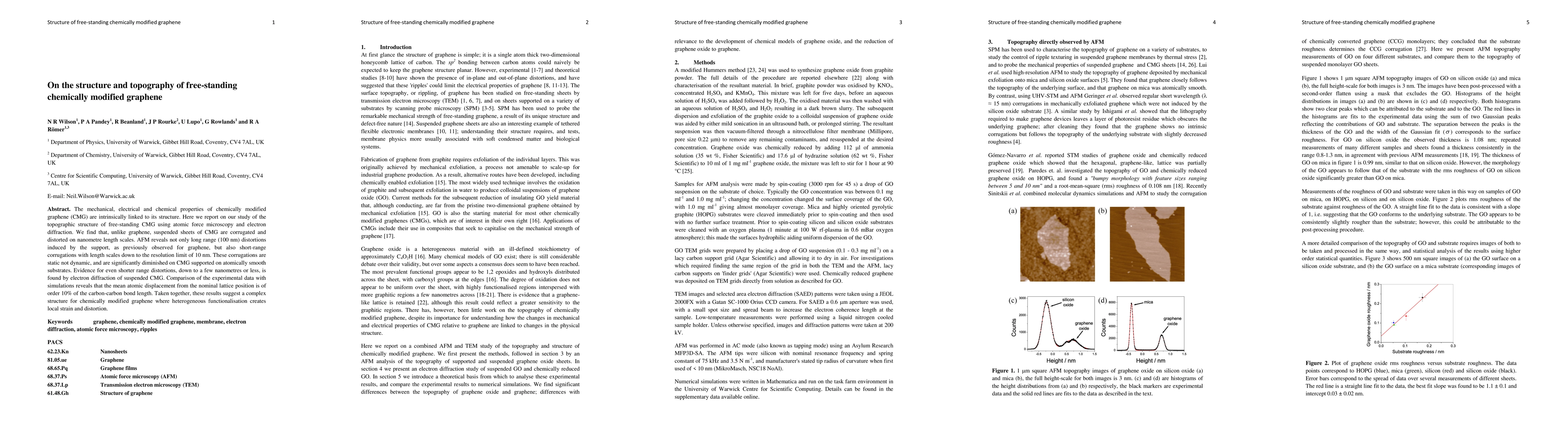 The mechanical, electrical and chemical properties of chemically modified graphene (CMG) are intrinsically linked to its structure. Here we report on our study of the topographic structure of free-standing CMG using atomic force microscopy and electron diffraction. We find that, unlike graphene, suspended sheets of CMG are corrugated and distorted on nanometre length scales. AFM reveals not only long range (100 nm) distortions induced by the support, as previously observed for graphene, but also short-range corrugations with length scales down to the resolution limit of 10 nm. These corrugations are static not dynamic, and are significantly diminished on CMG supported on atomically smooth substrates. Evidence for even shorter range distortions, down to a few nanometres or less, is found by electron diffraction of suspended CMG. Comparison of the experimental data with simulations reveals that the mean atomic displacement from the nominal lattice position is of order 10% of the carbon-carbon bond length. Taken together, these results suggest a complex structure for chemically modified graphene where heterogeneous functionalisation creates local strain and distortion.