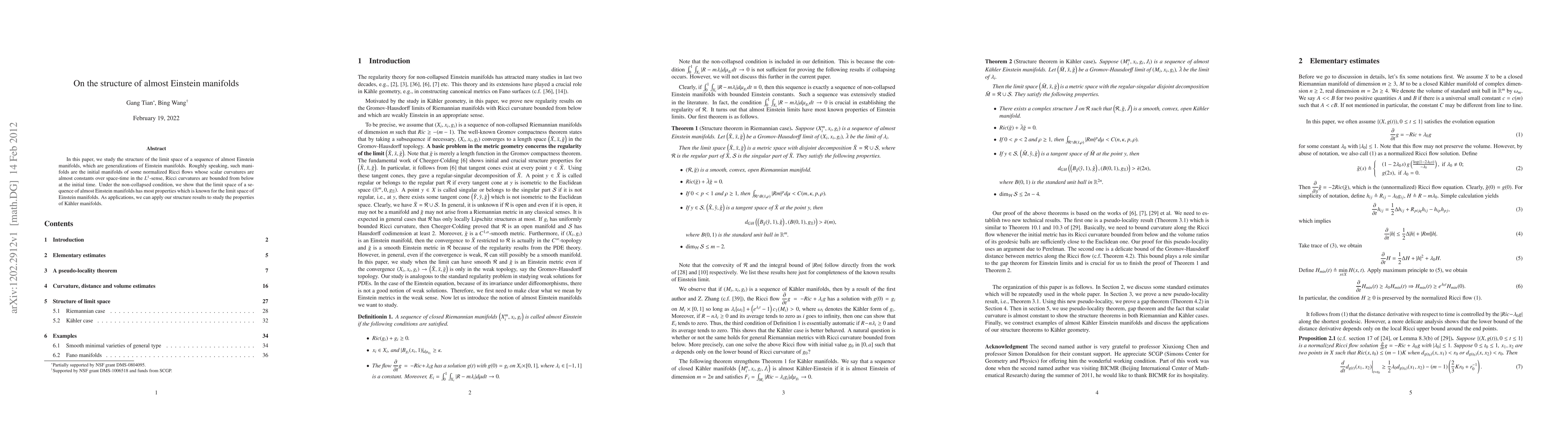 This paper studies almost Einstein manifolds and their limit spaces, showing they share many properties with Einstein manifold limit spaces under certain conditions. It provides new insights into the structure of these manifolds and has applications in understanding K"ahler manifolds.