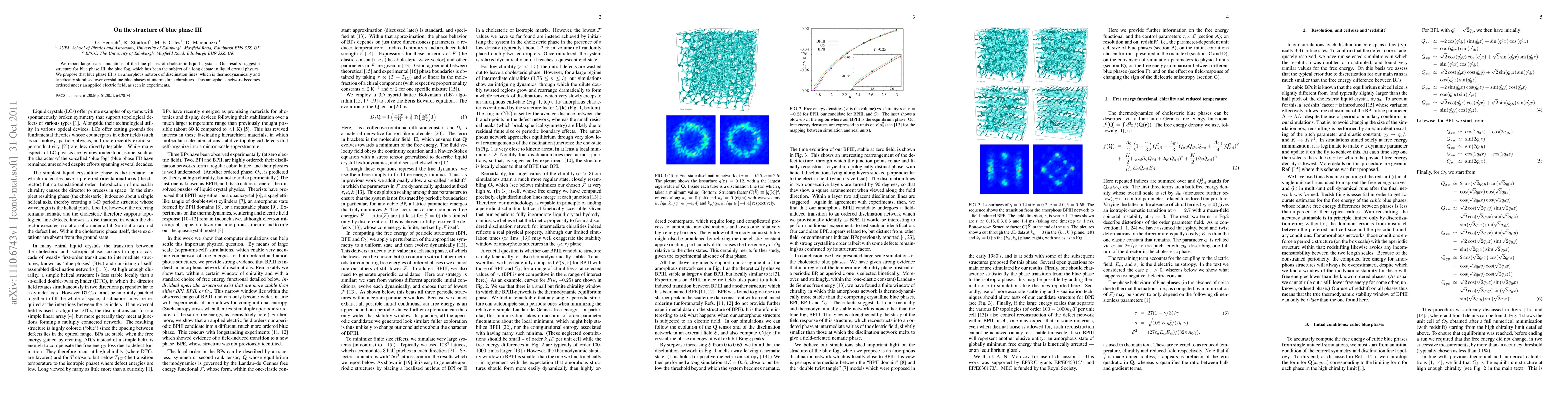 This paper reports large-scale simulations revealing that blue phase III is an amorphous network of disclination lines, resolving a long-standing debate. The structure is stabilized at intermediate chiralities and becomes ordered under an applied electric field.