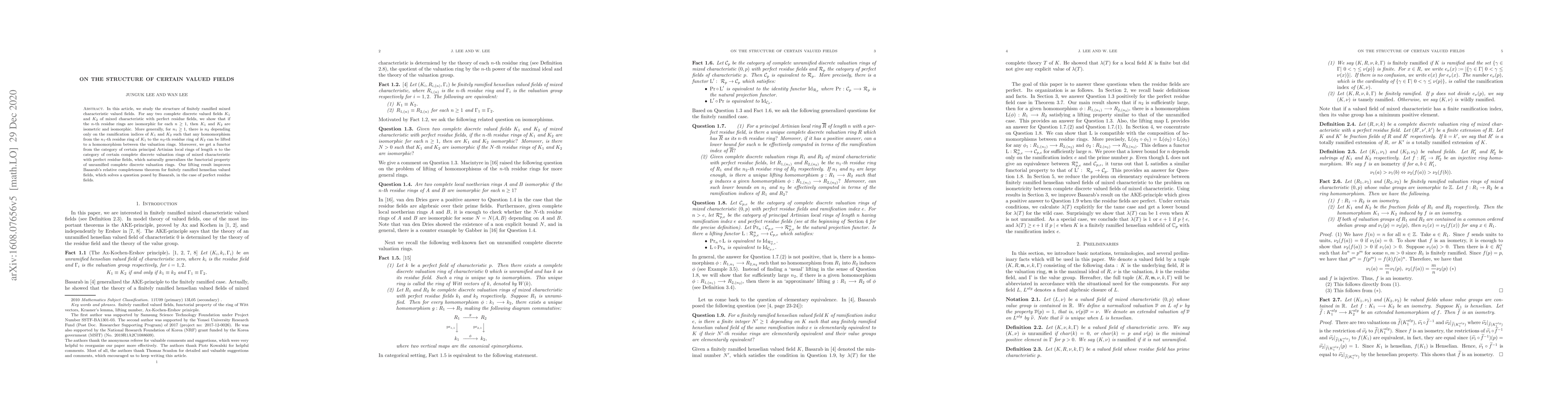 This paper explores the structure of finitely ramified mixed characteristic valued fields, proving that if the $n$-th residue rings of two complete discrete valued fields are isomorphic, then the fields are isometric and isomorphic. It also establishes a lifting result for homomorphisms between residue rings and introduces a functor relating certain principal Artinian local rings to complete discrete valuation rings.