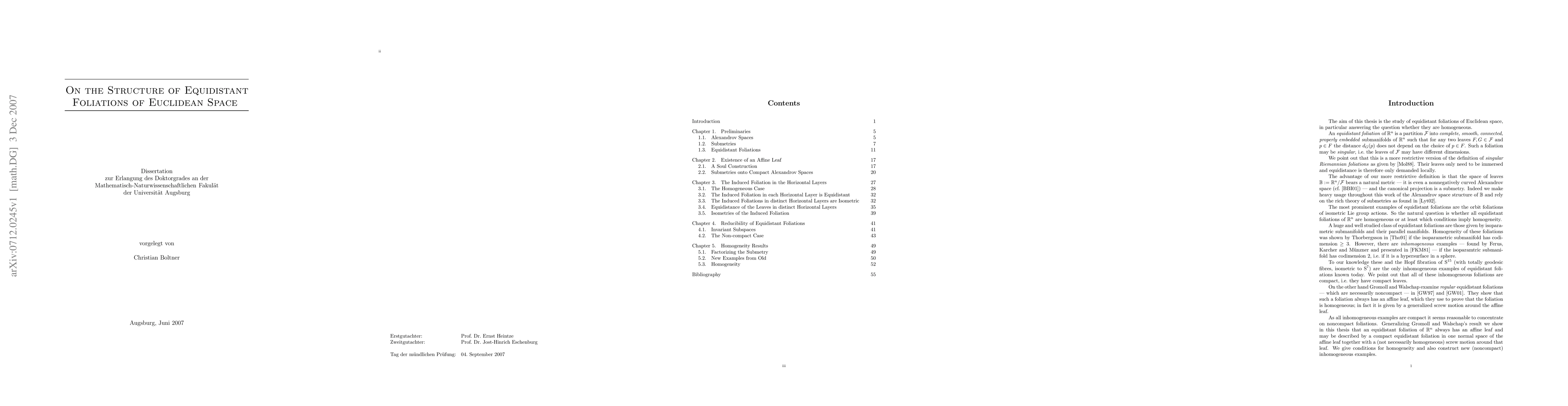 This paper explores equidistant foliations of Euclidean space, demonstrating the existence of affine leaves and proving homogeneity under certain conditions. It also provides new noncompact inhomogeneous examples and discusses reducibility results.
