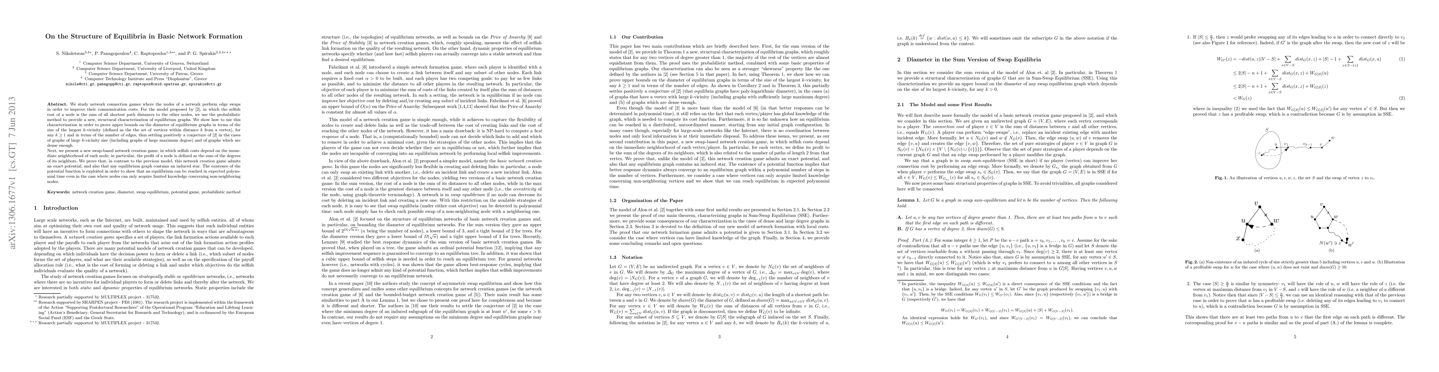 We study network connection games where the nodes of a network perform edge swaps in order to improve their communication costs. For the model proposed by Alon et al. (2010), in which the selfish cost of a node is the sum of all shortest path distances to the other nodes, we use the probabilistic method to provide a new, structural characterization of equilibrium graphs. We show how to use this characterization in order to prove upper bounds on the diameter of equilibrium graphs in terms of the size of the largest $k$-vicinity (defined as the the set of vertices within distance $k$ from a vertex), for any $k \geq 1$ and in terms of the number of edges, thus settling positively a conjecture of Alon et al. in the cases of graphs of large $k$-vicinity size (including graphs of large maximum degree) and of graphs which are dense enough. Next, we present a new swap-based network creation game, in which selfish costs depend on the immediate neighborhood of each node; in particular, the profit of a node is defined as the sum of the degrees of its neighbors. We prove that, in contrast to the previous model, this network creation game admits an exact potential, and also that any equilibrium graph contains an induced star. The existence of the potential function is exploited in order to show that an equilibrium can be reached in expected polynomial time even in the case where nodes can only acquire limited knowledge concerning non-neighboring nodes.