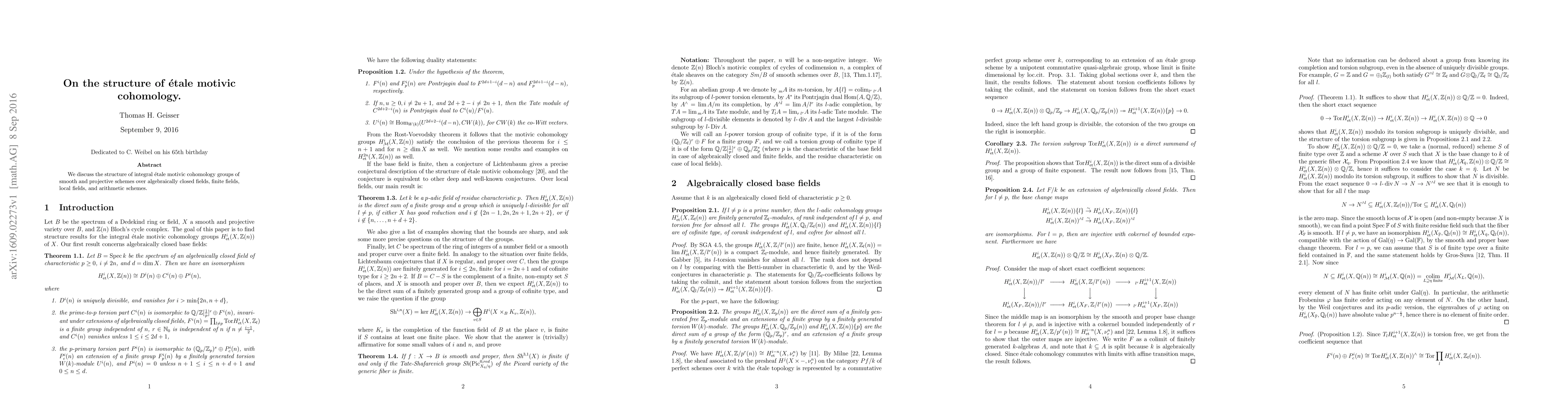 We discuss the structure of integral etale motivic cohomology groups of smooth and projective schemes over algebraically closed fields, finite fields, local fields, and arithmetic schemes.