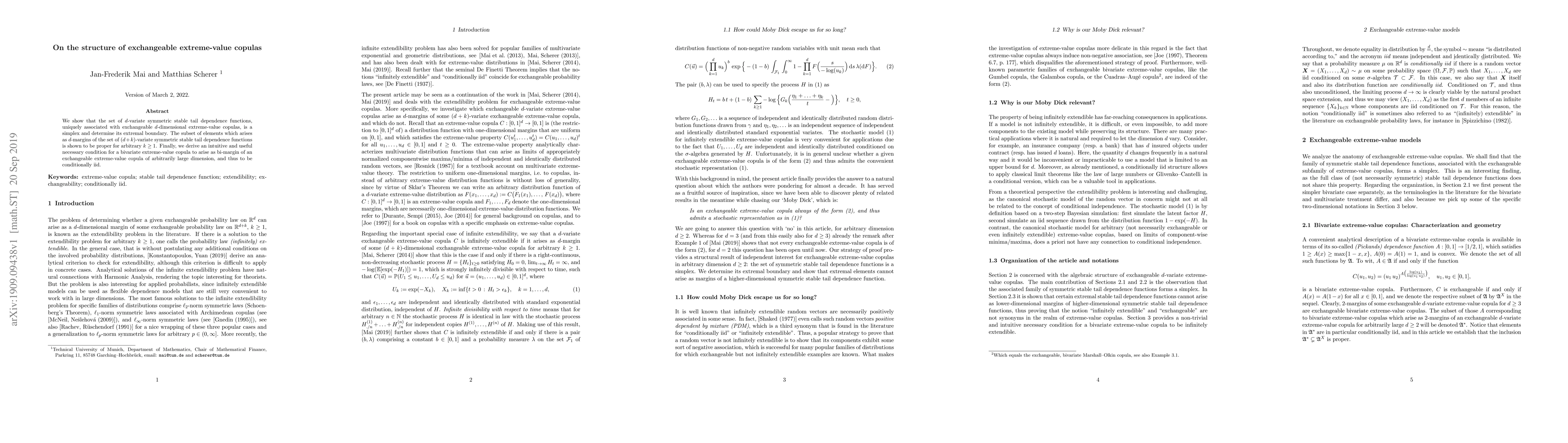 This paper explores the structure of exchangeable extreme-value copulas, demonstrating that the set of $d$-variate symmetric stable tail dependence functions forms a simplex and identifies its extremal boundary. It also provides a necessary condition for a bivariate extreme-value copula to arise as a bi-margin of higher-dimensional exchangeable copulas.